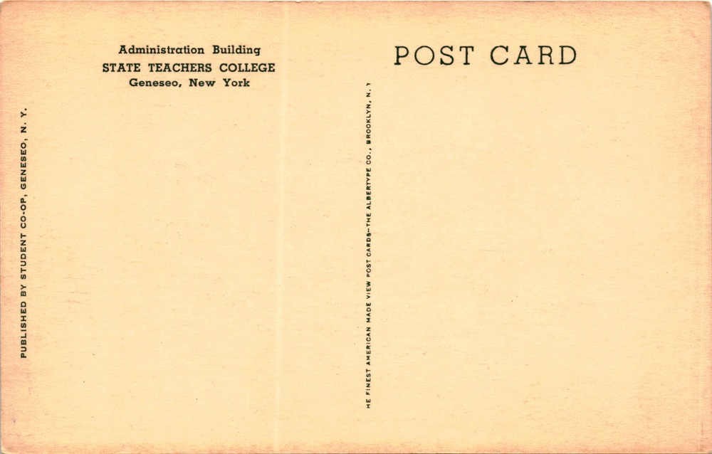 MAKE AN OFFER. THE MORE YOU BUY THE BETTER DEAL I WILL ACCEPT The postcard was published by the Student Co-op in Geneseo, New York, featuring an image of the Administration Building at the State Teachers College in Geneseo. The postcard boasts of being made by the Albertype Co. in Brooklyn, known for producing high-quality view postcards.