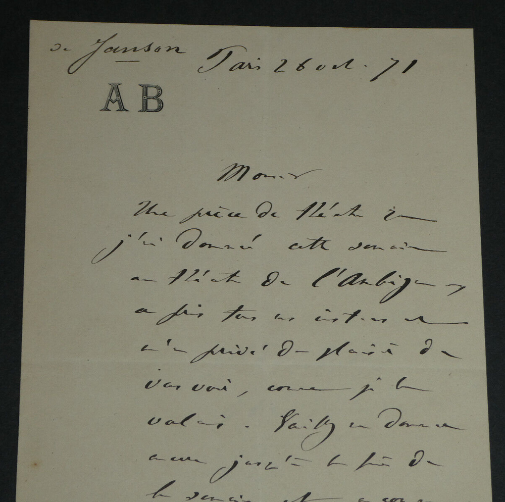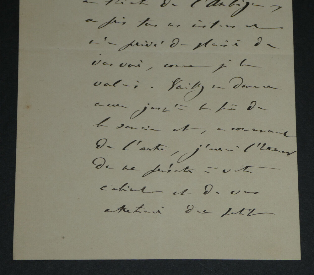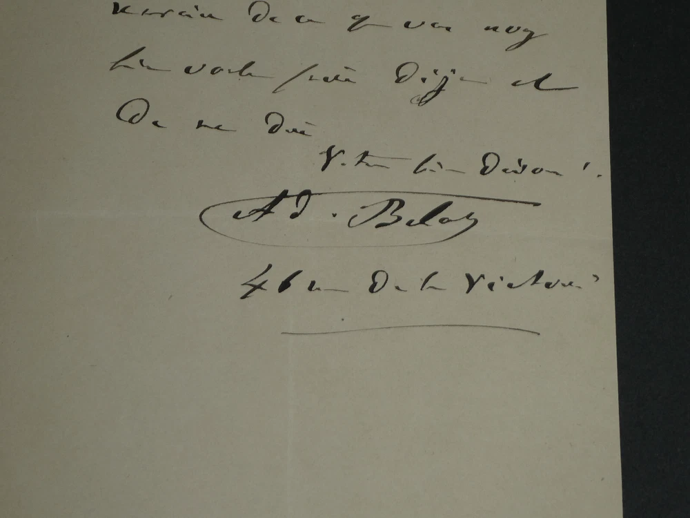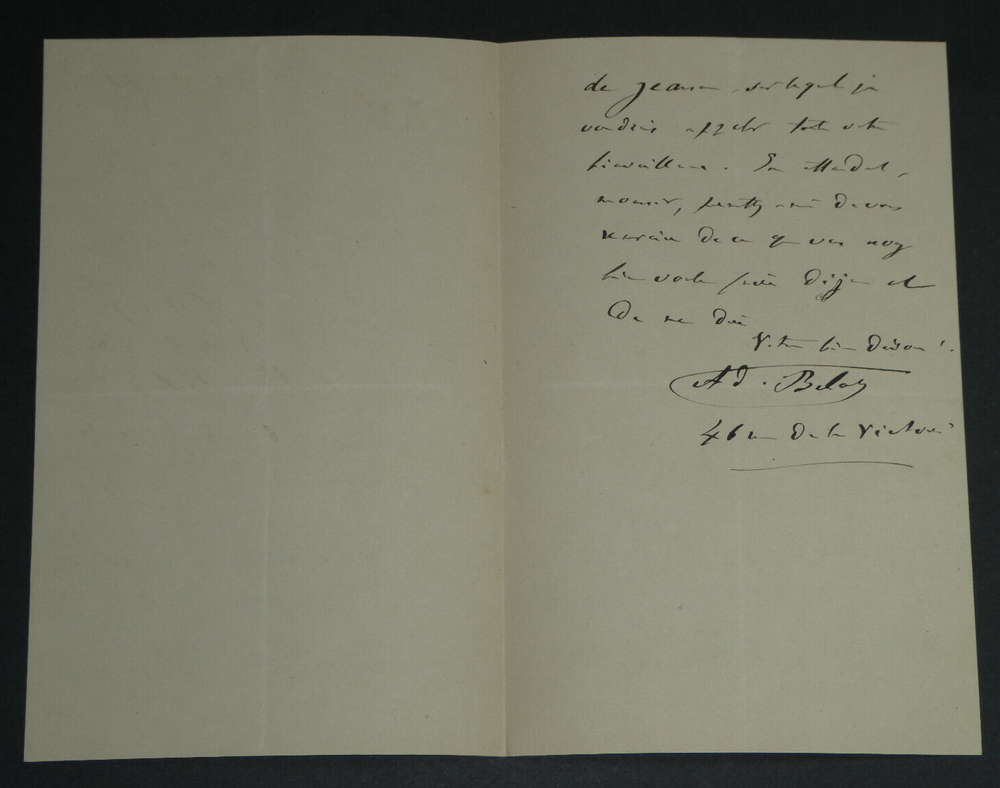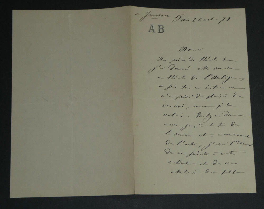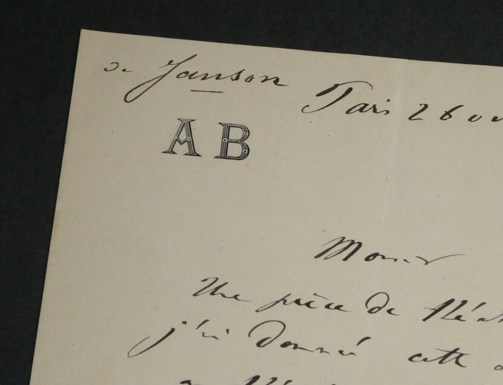 Free eBay listing template designed by dewiso.com Adolphe BELOT. Lettre autographe signée, 1871 Écrivain et dramaturge Lettre autographe signée d'Adolphe Belot, datée du 26 octobre 1871, sur un double feuillet avec ses initiales en entête. "Monsieur, Une pièce de théâtre que j'ai donnée cette semaine au théâtre de l'Ambigu (L'article 47 en 5 actes, 100 représentations) a pris tous mes instants et m'a privé du plaisir de vous voir, comme je le voulais. [...] " Dimensions : 13,2 x 20,7 cm État : Voir photos pour plus de détails. Nombre de pages : 2 pages Adolphe BELOT Louis Marc Adolphe Belot, né le 6 novembre 1829 à Pointe-à-Pitre et mort le 18 décembre 1890 à Paris 8ᵉ, est un dramaturge et romancier français. Wikipédia Contactez-nous Lettres autographes, vieux papiers, livres anciens, photographies, gravures, timbres... Nous expertisons et/ou rachetons dans toute la France vos lettres, collections de lettres et livres anciens. Paiement Sont acceptés les paiements par eBay, par PayPal, par virement ou par chèque. Envoi Envoi soigné dans un emballage rigide et étanche sous trois jours. Prévoir les délais postaux habituels en plus. Retour Satisfait ou remboursé. Si vous n'êtes pas entièrement satisfait, retour à la charge du vendeur pour l'Europe. À la charge de l'acheteur pour le reste du monde. Lettre autographe signée d'Adolphe Belot, datée du 26 octobre 1871, sur un double feuillet avec ses initiales en entête."Monsieur, Une pièce de théâtre que j'ai donnée cette semaine au théâtre de l'Ambigu (L'article 47 en 5 actes, 100 représentations) a pris tous mes instants et m'a privé du plaisir de vous voir, comme je le voulais. [...]" Dimensions : 13,2 x 20,7 cm État : Voir photos pour plus de détails. Nombre de pages : 2 pages