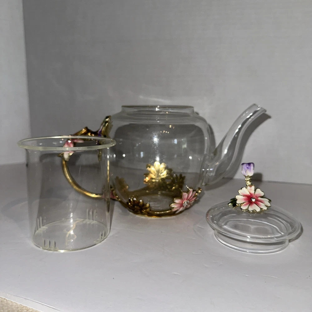 This Adorable Flower Clear Glass Teapot is a stunning addition to any collection. With a round shape and two compartments, this vintage tea pot is perfect for all occasions. Made of clear glass, it comes with a lid and should be hand washed only. Packaged in a box, this original piece exudes charm and elegance. Ideal for teapot collectors or those looking to add a touch of vintage flair to their kitchen decor.