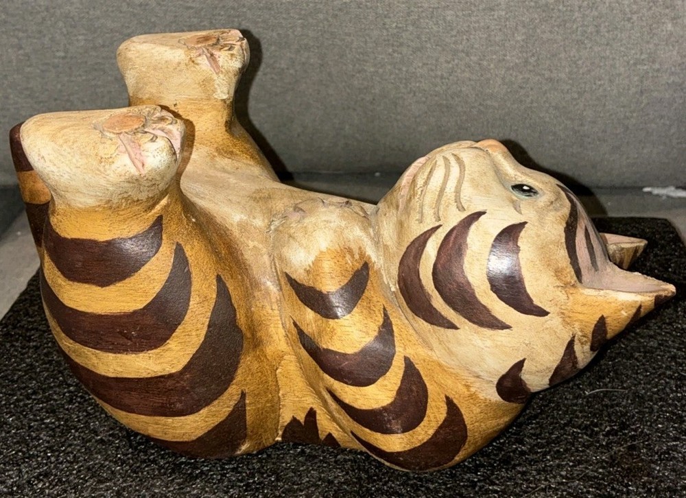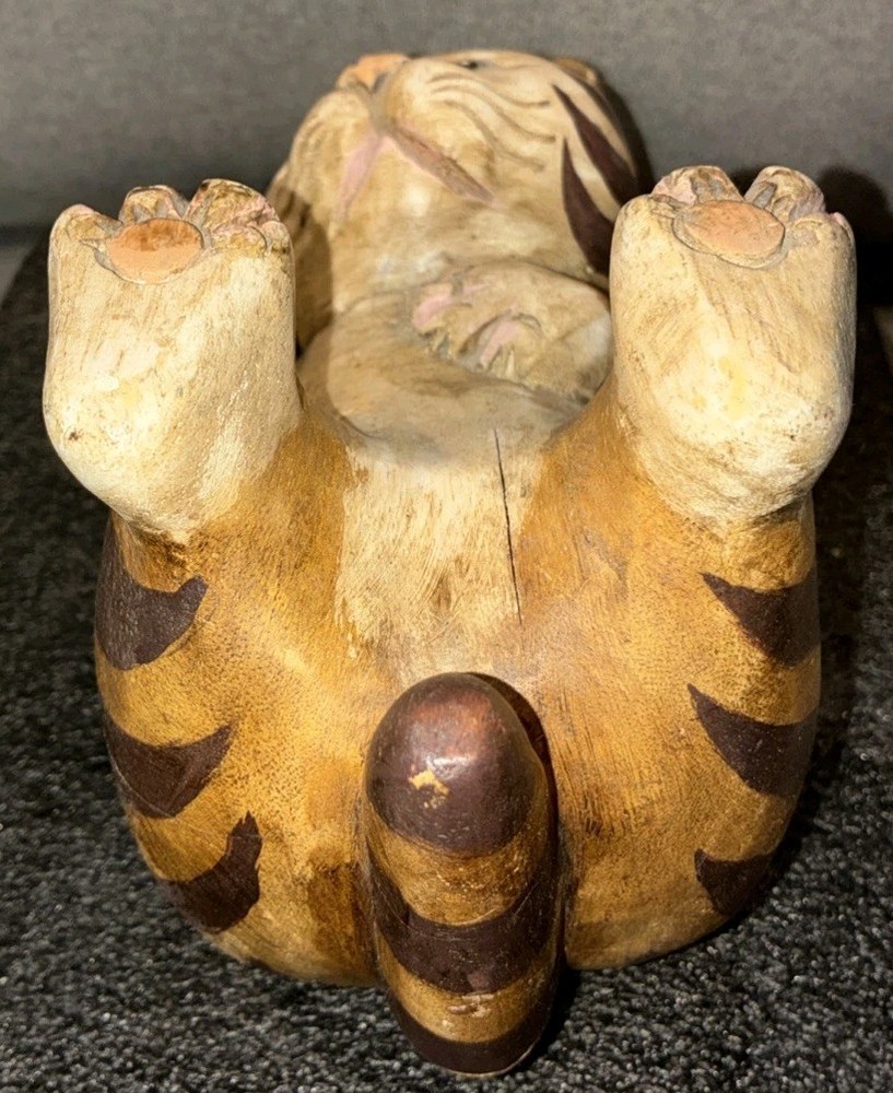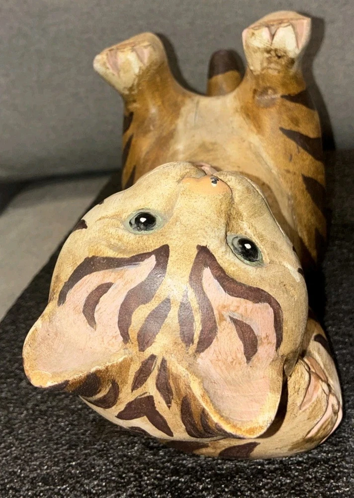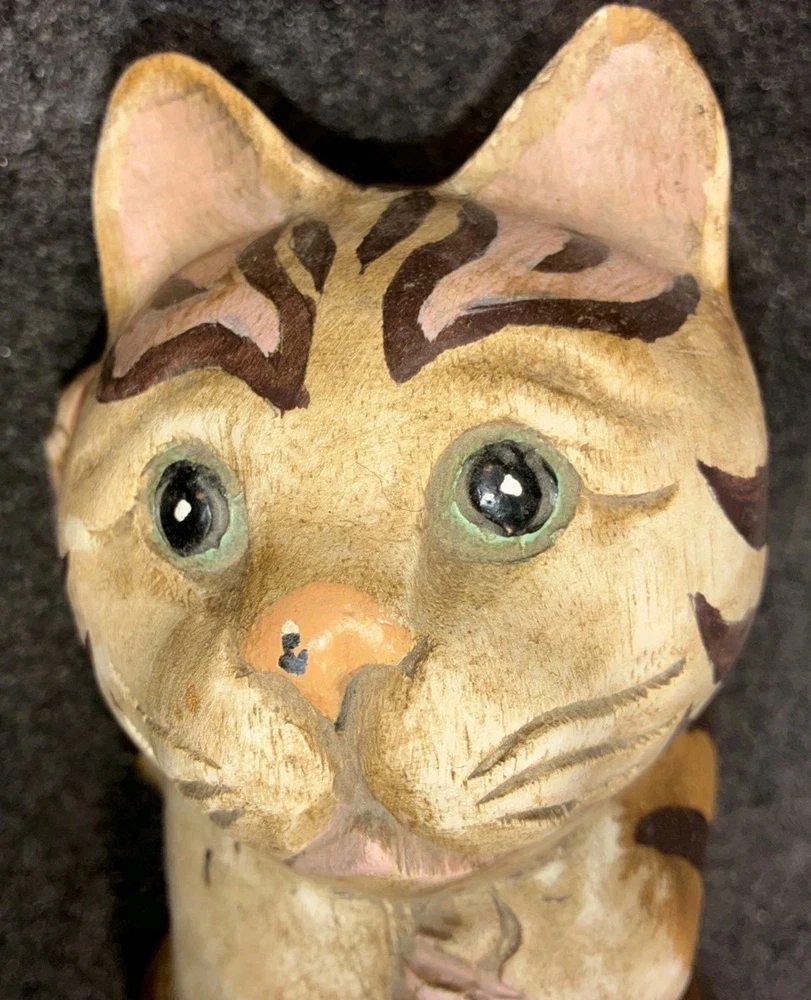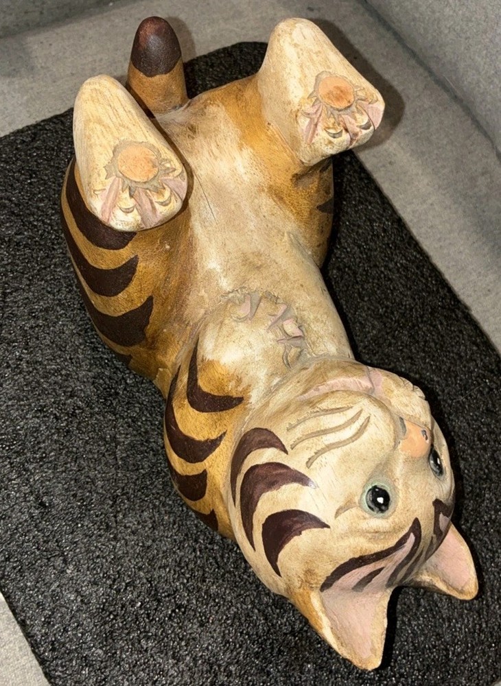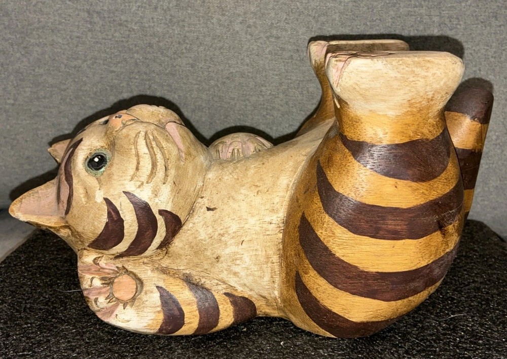 Adorable Tabby Cat Wood Figurine/Statue 5.75H Appropriate Measurements Height: 5.75" Width 10" Length: 4.5" Weight: 1 lb 12oz Item is in good used condition. Please note: the cat's left ear has a small piece of wood chipped off. Please see photos. Otherwise there are no other chips, nicks, scratches, cracks, damage, or repairs.