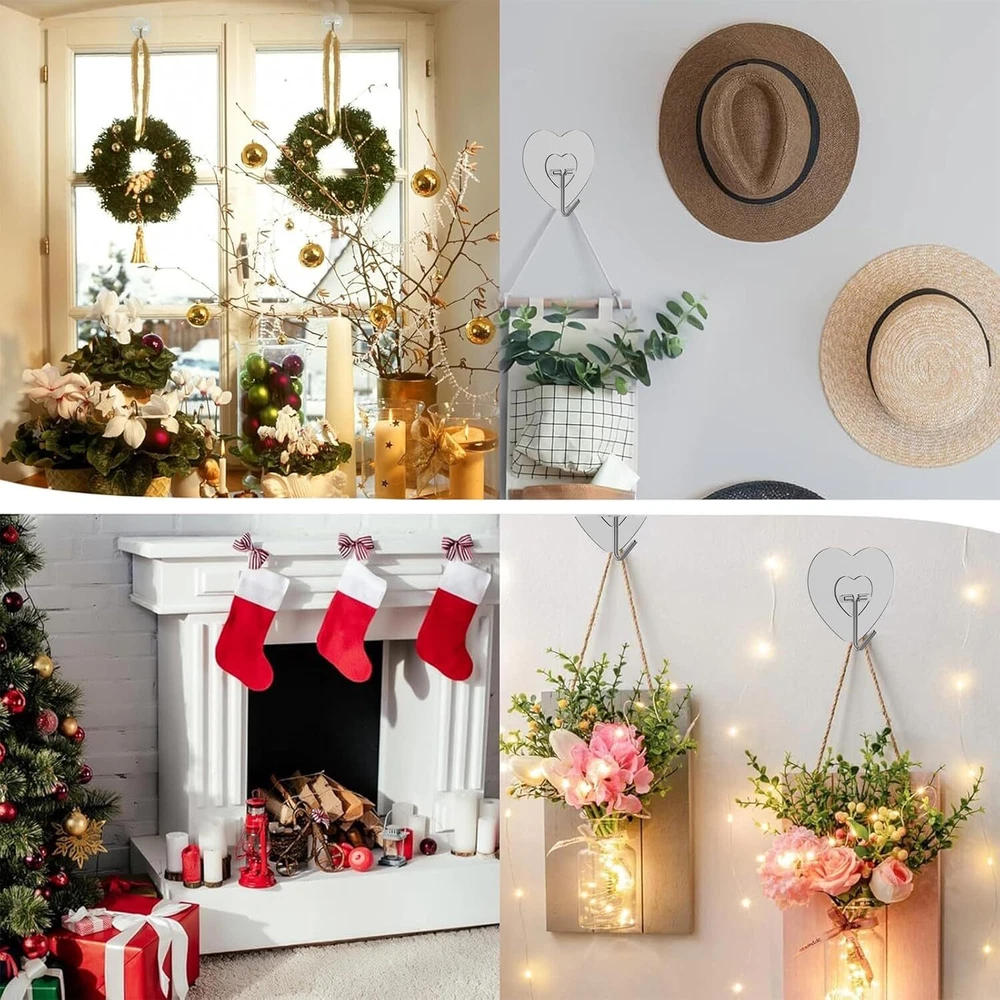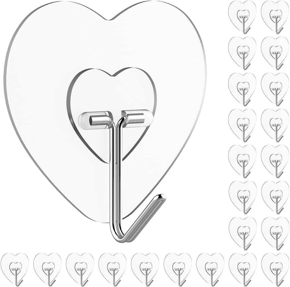 Adove Adhesive Hooks for Hanging, 24 Pack Heavy Duty Wall Hooks, Transparent Product Details Color: Transparent Brand: Adove Material: Stainless Steel, PVC Finish Type: Painted Mounting Type: Wall Mount SELF ADHESIVE HOOKS:24 pack heart-shaped adhesive hook will perfectly match your various home decoration styles; Ideal for Christmas Lights, Christmas wreath and Christmas socks also UTILITY HOOKS:These wall hooks heavy duty can be used as towel hooks, coat hooks, ceiling hooks, key hooks, picture hanging, shower hooks, outdoor hooks, bird feeder hooks, plant hooks, and dorm room essentials WIDE APPLICATION:Stick hooks widely used on a variety of surfaces, like Glass, Wood, Tile, Ceramic, Metal, Plastic and other smooth surfaces. (Tips:Not recommended for use on painted walls) EASY TO USE:No need to nail and drill, just tear off the protective layer on the back and paste hook in the desired position. Use a hair dryer easy to remove without surface damage PREMIUM MATERIALS:Self adhesive hooks made of strong stainless steel and PVC structure with good quality and long service life. It can also be used as ceiling hook for vertical suspension