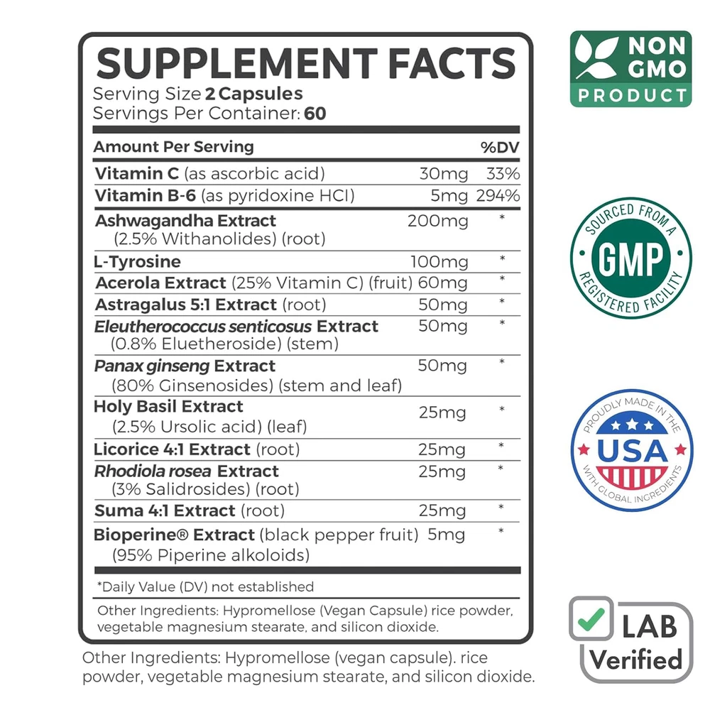 Effects: Adrenal Support,Reduce Stress Ingredients: Ashwagandha,Astragalus,Acerola, L-Tyrosine Directions: Take 2 capsules once daily after a meal. Shipping: Ships within 48 hours on working days. Shelf life: 2 years Description: Manage Stress: Too much cortisol flowing through the body can lead to decreased cognitive performance, imbalance, and more. Too little can bring on brain fog and restlessness. Use our Adrenal System Support supplement to achieve the proper balance by maintaining already healthy cortisol levels. Supports Adrenal Function: Supports the adrenal glands to help stabilize the body during times of stress. Document
