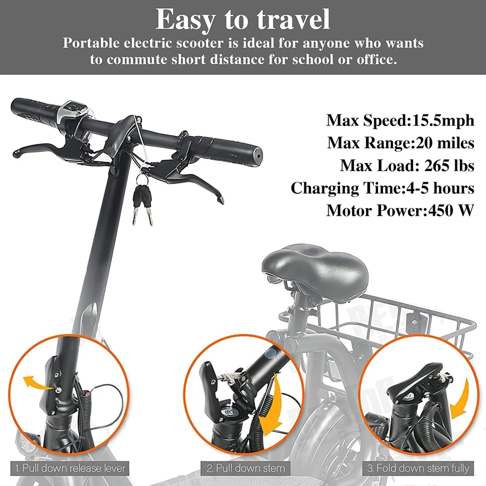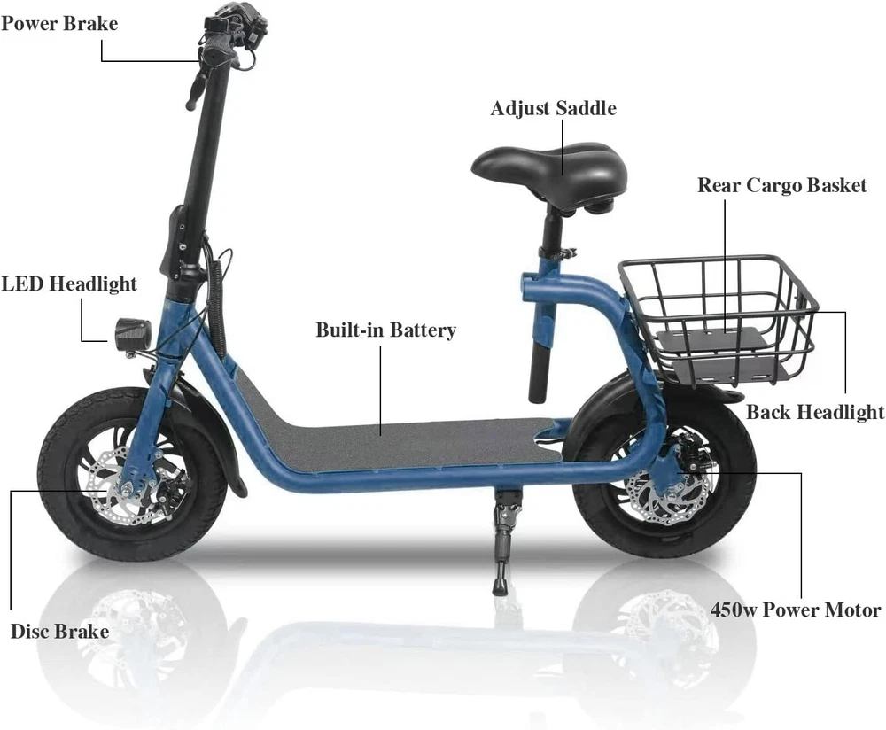 Adult Sports Electric Seated Scooter Folding E-Bike Commute UL 2849 Certified Feature Powerful Motor & Long Range: The adult electric bike comes with a 450W powerful brushless motor and large 40 cells 8.0Ah Lithium-ion battery, enables a 15-mile range, and a max speed of 15.5 mph. Portable & Lightweight: The foldable electric bike only weighs 42 lbs and can comfortably accommodate riders up to 265 lbs. This adult electric scooter can be easily folded and stored in the car trunk, which makes it perfect for commuters and students. Safe & Durable: With double braking systems, the front and back disc brake of the e-bike give you double safety. The 12" tires built for multi-terrain of daily use or outdoor activities. Detail Oriented Design: The E Scooter come with 13 x 11 inch rear carry basket and scooter deck, front LED light and rear reflectors for safety. Easy Assemble Required: The only assembly required is the seat and basket attachment. The handle bars are folded and just need to be erected. All tools are provided in the box. The E-bike have passed UL 2849 safety standard detec tionhttps://productiq.ulprospector.com/en/profile/ Package Listing 1 X E Scooter 1 X Charger 1 X User Manual 1 X Tool Kit After you receive the adults scooter, before first Riding, please do the follows: 1. Inflate the Tires before Riding. 2. Complete Charging (Light RED: Charging, Light Green: Charging Compelte). Payment Shipping Return Feedback Question Payment We accept payment via Paypal ONLY. Immediate payment is required & Shipping will be arranged only your payment is cleared. Shipping Same business day dispatch if paid by 4 pm EST(1 pm PDT). No shipping on weekend or Public Holidays & No responsibility for any customs duty. Return We stand behind our products. Items can be returned for exchange or full refund within 60 days from the date you receive your item. Return shipping is the responsibility of buyer unless the return is a result of our mistake (i.e., your receive the wrong item or damaged item). We will pay for shipping replacement back to you if an exchange is requested. If you want to initiate a return, simply clicks "Return this item" next to the transaction in My eBay, chooses a reason, and prints a return shipping label and packing slip. We’re automatically notified. Feedback Please leave us a FIVE star and POSITIVE feedback if you are satisfied with our product and service. Neutral or negative feedback will not solve problems happily. We believe communication will fix problems and hope every customer can have a good purchasing experience. Question All ebay message will be responded within 1 business day or less, except weekends and holiday!