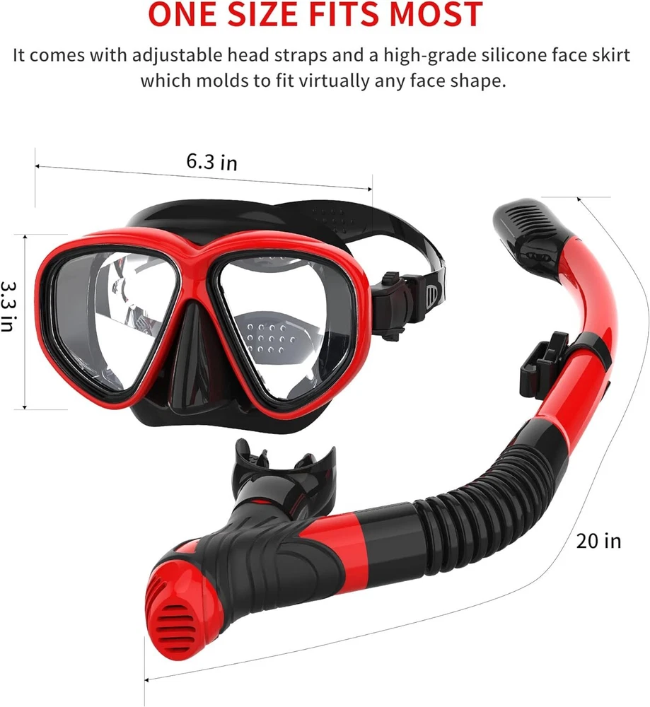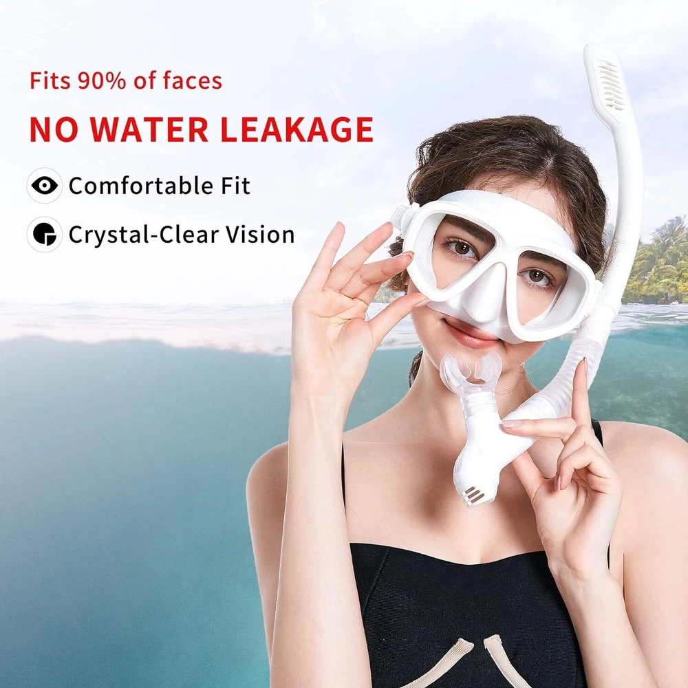 Product Description SwimStars Snorkel Set, Anti-Fog Diving Mask, Comfortable Adult Scuba Mask with Tempered Glass, Men's and Women's Snorkeling Gear About this item Anti-leak & Anti-fog Technology: Experience hassle-free snorkeling with our snorkel set, equipped with anti-leak and anti-fog technology. Enjoy clear visibility and a secure seal with our high-quality masks. Say goodbye to leaks and fogging, and dive into the underwater world with confidence. Dry Top Snorkel with Purge Valve: Our snorkel features a dry top design for easy breathing underwater. It has a float valve to prevent water entry and a one-way purge valve to clear any leaks. The fixed buckle allows for easy attachment to your diving mask. Food-Grade Silicone Material: Our snorkel set is made of high-grade liquid silicone, ensuring comfort and skin safety. The hypoallergenic silicone skirt protects your face from allergies and is easy to clean. Suitable for long-term use in free snorkeling. Food grade silicone mouthpiece for maximum comfort. One Size Fit Most Faces: The fully adjustable head strap with an upgraded button buckle accommodates all head sizes. Advanced silicone face skirts mold to fit all face shapes, making it suitable for both men and women. Ideal for professionals and beginners alike. Convenient Carrying Bag: Our set comes with a practical carrying bag, making it easy to transport, rinse, dry, and store after use. Lightweight and perfect for those with a desire to explore the breathtaking underwater world by traveling around the globe. You can't go wrong with the SwimStars snorkel set! Enjoy brighter and clearer visibility underwater, with many color combinations for both men and women! The SwimStars diving mask and snorkel for adults make snorkeling enjoyable and are also eye-catching in photographs! The mask body is designed entirely supremely and beautifully with curves. It has no center frame; you will get a bright, broad field of view and less feeling of restriction. We want to create products that people can trust. We want as many people as possible to be able to discover the underwater world while having a good time. The set includes Dry Top Snorkel, Snorkeling Mask, Gear Mesh Bag, and User Manual. Why Choose Us? SwimStars Snorkel Excellent snorkel gear for beginners Fits most face shapes, comfortable Beautiful single-lens design Anti-fog coating Buckle adjustment is easy to manage Durable frame 100% dry snorkel Carrying Bag Easy Headstrap Adjustments Thanks to a comfort fit liquid silicone skirt, SwimStars’ speed fit buttons for easy head strap adjustments, and a split silicone head strap, the mask provides an easy-to-adjust water-tight seal that is comfortable on the face. 100% Silicone Snorkel Mouthpiece Many people are afraid of snorkeling because of the jaw fatigue from the mouthpiece and the disgusting silicone smell. This snorkel is made of “food-grade” silicone, which helps to eliminate the foul odor and the stress on the jaw. That makes it an ideal choice for beginners. Don't Forget to Remove The Plastic Film When you first get your snorkel mask, there is a plastic film on the inside lens. This plastic film is for protection (anti-fog coating) during transit; please remove it before use. Crystal-clear Vision Advanced single-lens shape design and tempered glass with anti-fog treatment mean you'll have a crystal clear underwater experience, no fog, especially for beginners. One Size Fit Most Faces This scuba mask and snorkel set is great for outfitting the whole family. With various colors, you are sure to find something for the whole family. And it comes with fully adjustable head straps and a high-grade silicon face skirt that molds to fit virtually any face shape. Perfect fit for men, women, and teenagers. Perfect For Swimming in A Regular Pool Our masks are great for teenagers or anyone with sensitive eyes! You can wear a snorkel mask to swim in the ocean or in a regular swimming pool. Many adults have found that swimming laps with this mask is preferred over regular goggles. MAINTENANCE AND STORAGE 1: How to Clean Rinse the entire snorkel set with fresh water after every use and let air dry in the shade. Keeping your mask clean is the key to ensuring the anti-fog properties work properly! 2: Storage Keep your mask stored inside the protective bag when not in use. If you are storing for long periods, ensure the mask is completely dry, as excessive moisture can cause the film to degrade faster. 3. Anti-fog Coating The interior of the glass is coated by a thin anti-fog coating, so the mask does not require pre-treating. To protect the anti-fog coating, please do not scrub, burn, scratch, or aggressively wipe the inside lens of your mask. 4: Warm tips The mask lens has an enhanced safety feature with its tempered glass. However, it will shatter with the strong impact. Reckless diving, such as diving over your head or risking a collision with hard objects, can result in damaging the product and physical injury. About Us Payment Shipping Returns Contact Us We pursuit 100% transactions satisfaction,We attach importance to every customer from around the world,Please buy with confident!if you have any issue,you can just give us a message,and we give you full resolve. We guarantee 100% customer satisfaction. We will offer professional product support:Product Inquiry,Aftersale Service,Shipping solution and so on.If you got question or problem,please just contact us by ebay message. We can accept PayPal payment ONLY.Because we can't accept any other payment method.Hope understand. Item will be shipped within 1-3 business day after full payment is received. Delivery time depends on destination and other factors, if you still not received it in normal days. Please don’t worry, I hope you can give me a message before you do any action. If the item is defect when you receive it or you are not satisfied with it, please return it within 30 days for a replacement or money back. But the items must