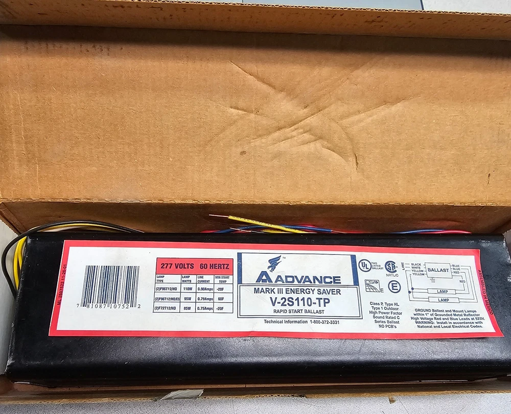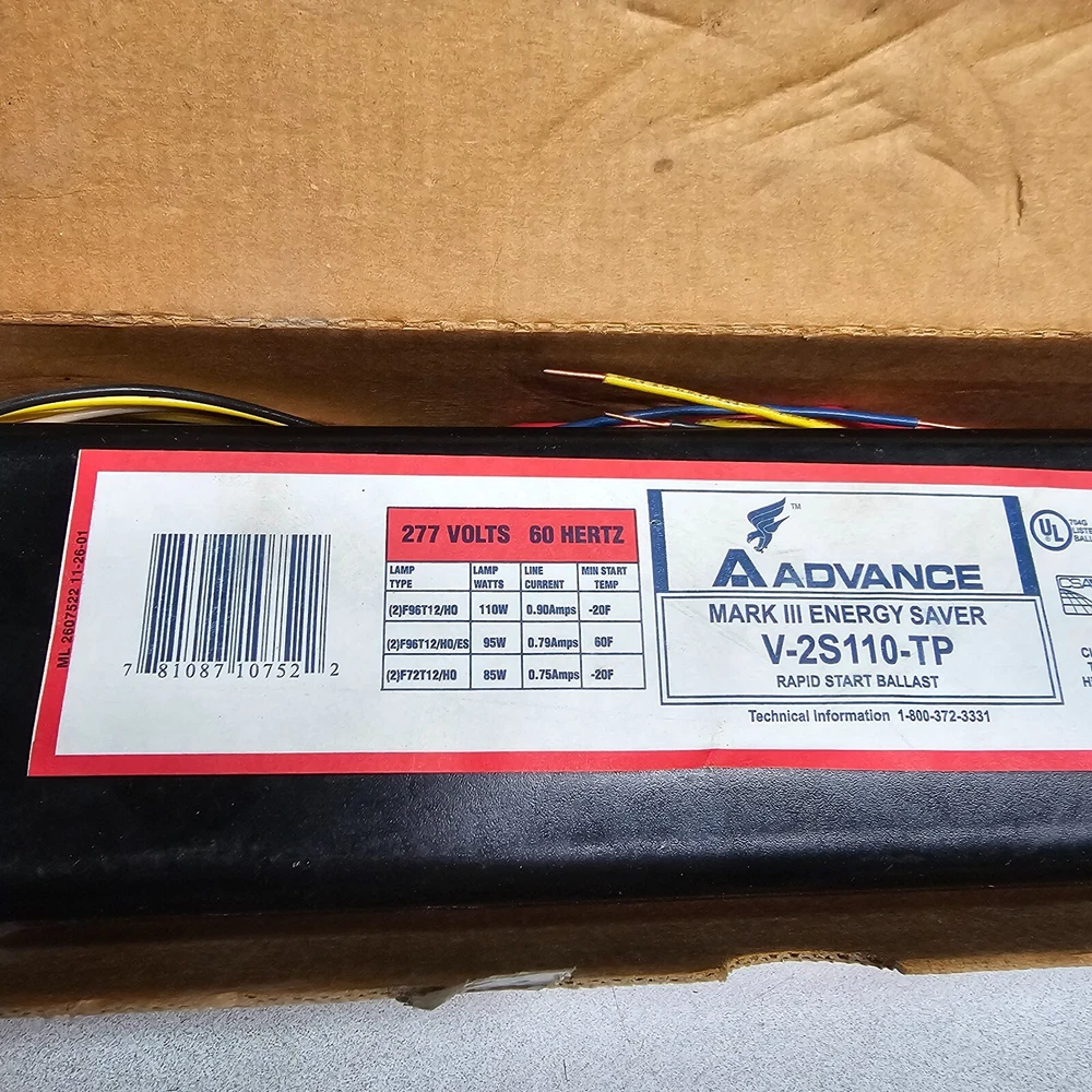 Advance V-2S110-TP, Magnetic Fluorescent Ballast, MARK III, 2-Lamp, (2)F96T12/HO, (2)F96T12/HO/ES, (2)F72T12/HO ** Thank you for shopping with SUSA International. ** Products - All items may show signs of storage wear from the industrial environment. SUSA International is not partnered or affiliated with any manufacturers of listed products. All products are sold as listed with descriptions & conditions as accurate as possible. Pictures may be taken of a single item from a batch of items, therefore product shipped may not be the exact item pictured. Shipping - Packages are usually shipped within 1 Working Day of payment receipt. (Excluding Saturday/Sunday) International buyers, whatever the custom duty or charges if any will be borne by the buyer. As different countries charge Different Custom Duty. Buyer is responsible for Paying all the charges. If for some reasons shipping of the product is delayed, you would be duly informed about the same along with the expected date of shipping. Payment - Payment must be received within 7 days. If payment isn't received within 7 days, the listing will be revoked and a Non-Paying Buyer alert will be filed. Returns - All items are sold as it is. We accept returns only if the item was not as described in the listing. Buyer must return the item exactly as received within 7 days and will be responsible for all additional shipping. We do our best to present accurate, detailed information about every item we sell. If you have any questions, please contact us before Buying. Feedback - In case you are not satisfied, please contact us immediately. We will do everything possible to please you and bring a smile on your pretty face. Looking forward for your Positive Feedback. We believe that all disputes can be settled by proper communication. So please communicate for faster resolution.