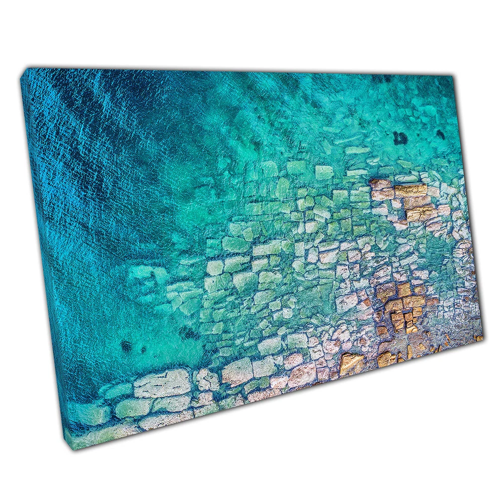 Aerial View Of Blue Clear Ocean Rocks And Stones Canvas Wall Art Print