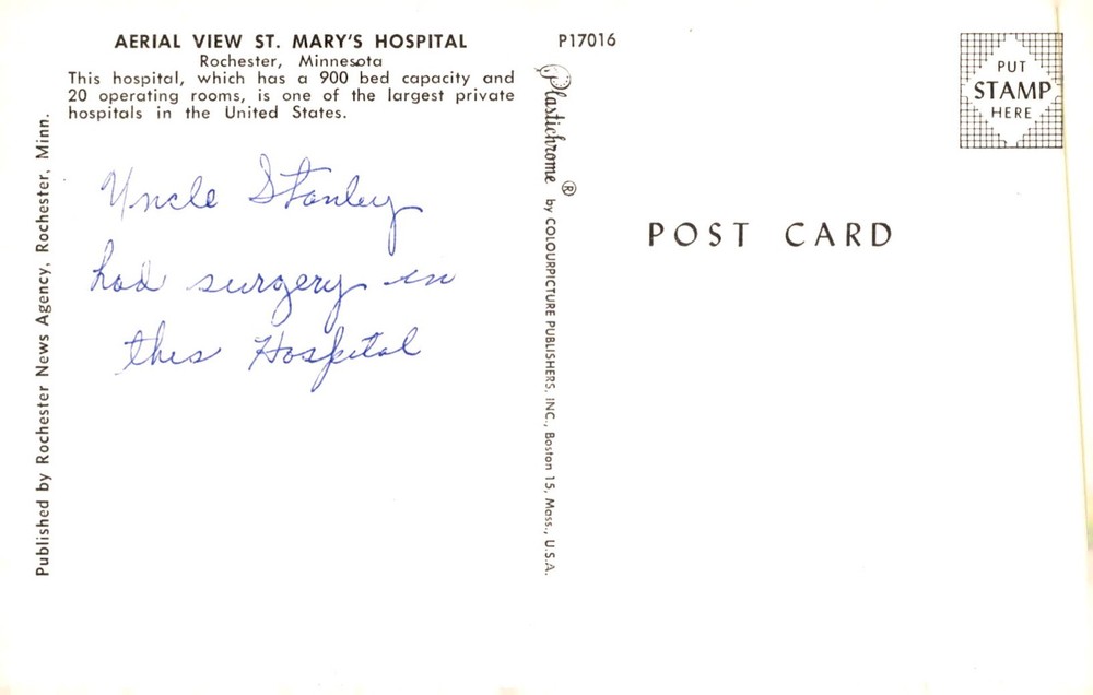 MAKE AN OFFER. THE MORE YOU BUY THE BETTER DEAL I WILL ACCEPT St. Mary's Hospital in Rochester, Minnesota boasts a 900 bed capacity and 20 operating rooms, making it one of the largest private hospitals in the U.S. The aerial view captures its vast facilities.