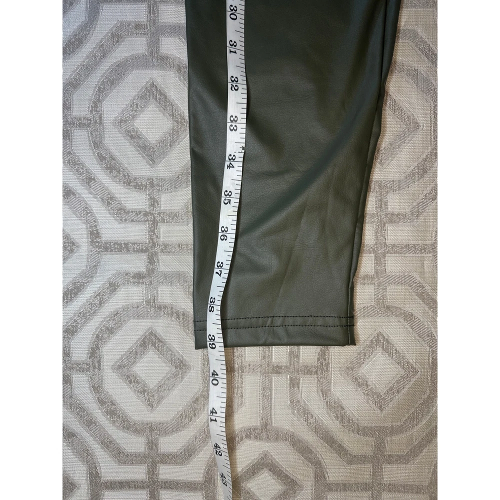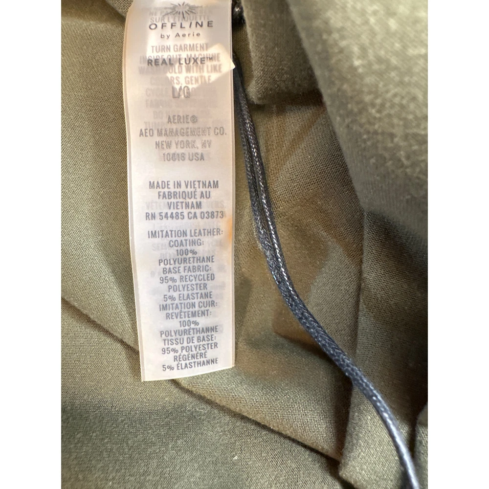 Offline by Aerie Faux Leather Leggings Soft Stretch Green Sz large The Details THE FABRIC: NEW! Real Our Luxe faux leather is soft as ever, comfy as always, and built for strutting it out. THE DEETS: Faux fly deets to elevate any outfit. Materials & Care 95% Recycled Polyester, 5% Elastane Machine wash Size & Fit THE FIT: High waisted. Full Length.