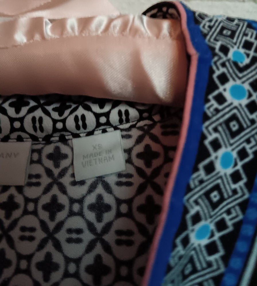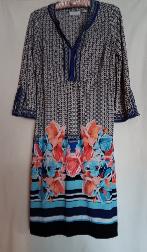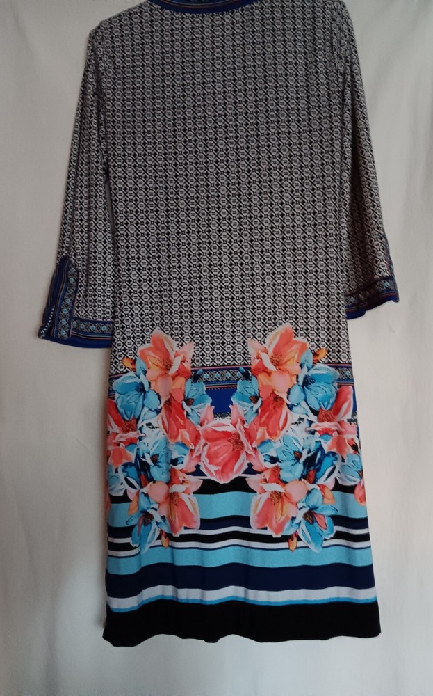 This beautiful dress from New York & Company is perfect for any casual occasion. The multicolor pattern and bohemian theme make it a unique addition to any wardrobe. The dress features a V-neckline and 3/4 sleeves, with a knee-length shift style that is both comfortable and stylish. Made from a combination of polyester and spandex, this dress provides stretch and comfort, and is perfect for sizes XS. The pullover closure and slit sleeves add to the overall design. This dress is not vintage and was manufactured in Vietnam. Add this dress to your wardrobe today and enjoy its beauty and comfort.
