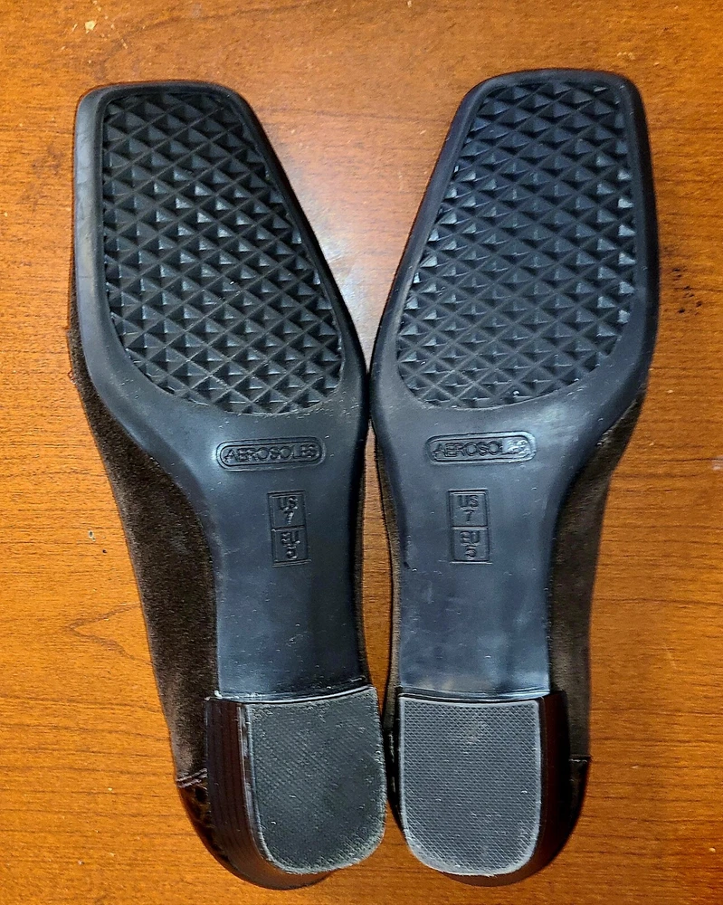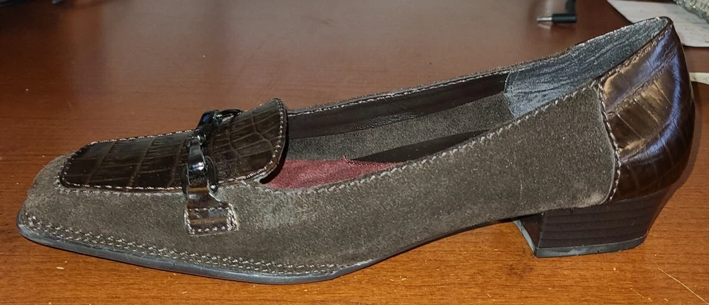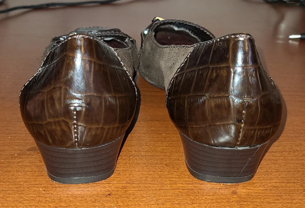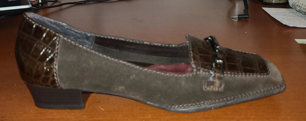 Elevate your work wardrobe with these stylish wedge slip-on loafers from Aerosoles. These glossy brown croc print shoes are perfect for any occasion and feature a square toe shape, comfortable wedge heel, and slip-on closure for easy wear. Made with synthetic upper material, these shoes are both durable and fashionable. The comfortable shoes have a medium width and are perfect for women with US shoe size 7. The crocodile pattern and the brown color give it a unique look that is perfect for any formal or casual occasion. Whether you're looking for a comfortable shoe for work or a stylish one for a night out, these Aerosoles Playfill loafers are the perfect choice.