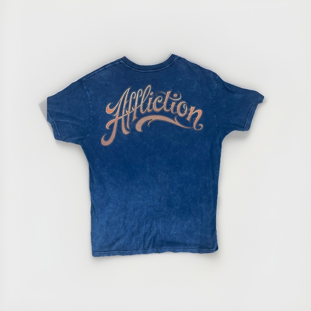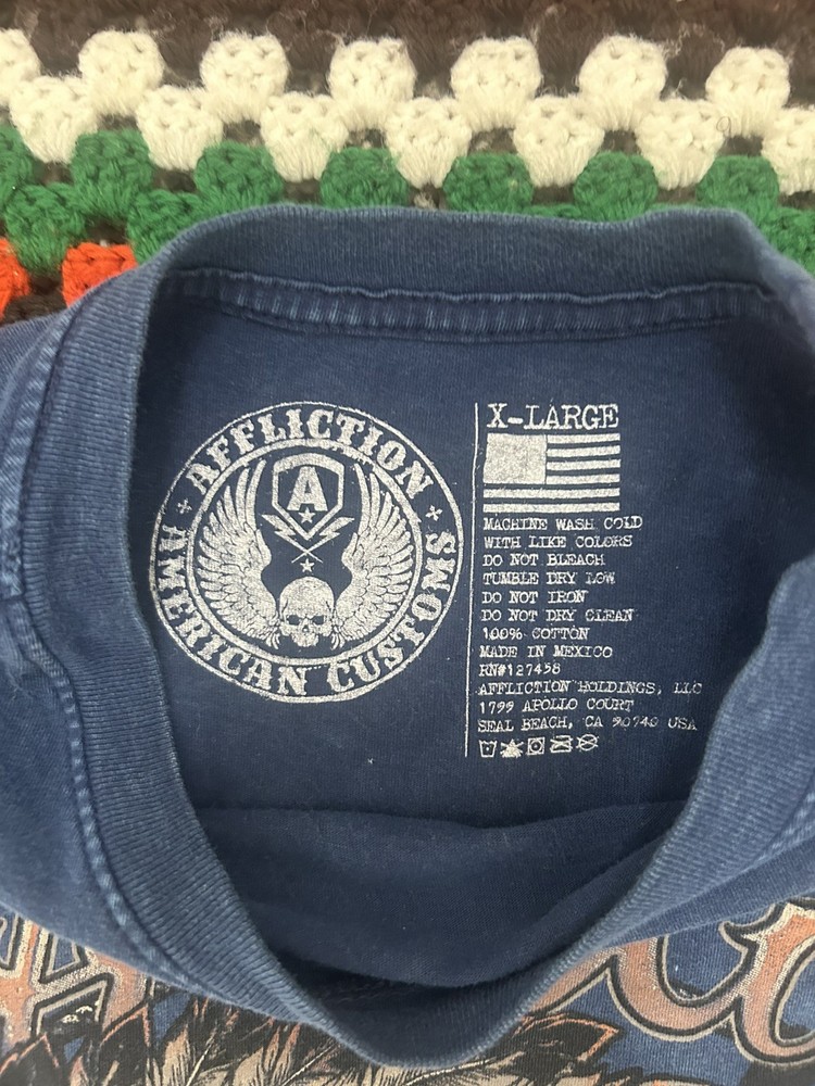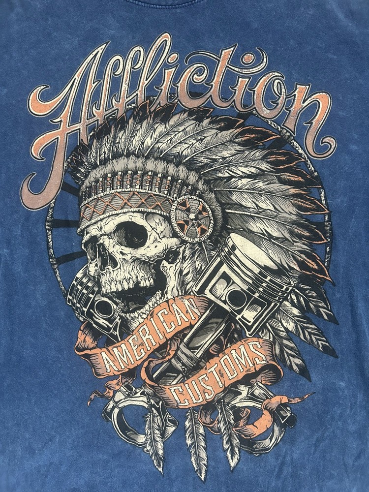 Brand: Affliction • Line: American Customs (their biker / mechanic / gritty Americana line) • Size: XL (from the neck print) • Material: 100% cotton • Made in: Mexico • Style era: Late 2000s–early 2010s Y2K/MMA era Affliction