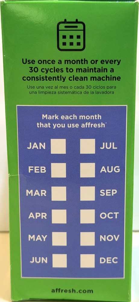 Prevents washer buildup with monthly maintenance Fits any washer type including HE machines Eliminates washer odors with specialized sufactants NO. 1 WASHING MACHINE CLEANER TABLET*. *Whirlpool Corporation calculation based on US Whirlpool (Synd) database for the Washing Machine Cleaner category for 52 Weeks Ending 3/22/2025 time period. Copyright 2025, Nielsen Consumer. HELPS POWER AWAY SMELLS created by odor causing bacteria, soap scum and stinky grime hiding deep inside the washing machine’s pump, valve, drum, basket/tub and filter to help optimize appliance performance. TIME RELEASE TABLET. Affresh time release tablets are scientifically designed to deliver extended cleaning action throughout the wash cycle, working deep inside important washer components for an exceptional clean. TRUSTED BY APPLIANCE EXPERTS. With over 100 years of appliance innovation, affresh appliance care gets the tough jobs done right! SAFER FOR PEOPLE. SAFER FOR PLANET. Affresh washing machine cleaner is EPA Safer Choice Certified and is septic safe. NO. 1 RECOMMENDED WASHING MACHINE CLEANER cleaner brand by Whirlpool, Maytag and Amana.* *affresh products and the recommending brands' products are all owned and distributed by Whirlpool Corporation. SAFE FOR ALL WASHING MACHINES, all makes and models, including front and top load models and HE (high efficiency) washers. DID YOU KNOW? Odor causing bacteria can transfer onto clothes, sheets and stuffies. Deep clean with affresh washing machine cleaner for a confident clean you can trust.