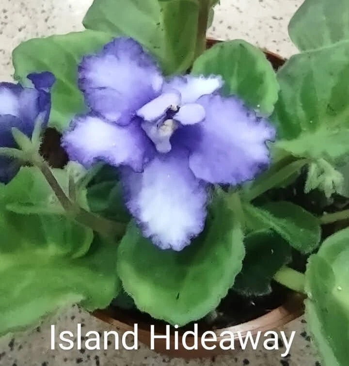 ISLAND HIDEAWAY (8518) 11/9/1996 (S. Sorano) Semidouble white ruffled pansy/blue-purple blushed eye, edge. Medium green, plain. STANDARD I am a collector and hobby grower of African Violets. All plants are grown from leaves of my own plants using the best soil and additives. You are purchasing a LEAF POT which is a newly sprouted or very early propogated plant in a 2oz or 3oz cup. I have started the plant for you from a leaf under MY growing conditions. Your conditions will probably differ from mine. The tiny plant needs time to mature. No repotting, the plant will not survive. Very, very light moisture. If you are new to growing violets, I strongly urge you to find information on your specific variety from the AVSA website or from hundreds of videos available. The plant you will receive is the one in the picture (in the cup). When available, I will include a picture of my stock plant in bloom to give a better idea of bloom and leaf size, shape and color. This is NOT the plant you receive. The Leaf Pots are not in bud or in bloom. SHIPPING : Shipping is a flat fee of $12.00. All plants are shipped via USPS Priority Mail, using fiberglass insulation. ***** It is YOUR responsibility to monitor your weather. Need me to hold an order for a few days? Send a message. My plants are very carefully packed for shipping. Occasionally, there may be spilled soil or a broken leaf. Broken leaf? Snip the very edge of the stem and put it back in the soil. You will have a new plant in no time! This is not considered damage. If you receive a box that has been damaged during shipment, please message me with pictures UPON RECEIPT. Most issues can be resolved through good communication. Shipping is to the US only. Your tracking number indicates your delivery date. You will also receive emails updating the exact delivery date. You are responsible to ensure the box does not sit out in hot or cold temperatures. The plants will cook or freeze in extreme temperatures. This "damage" is your responsibility and is not refundable. Feel free to message me with any questions prior to purchase. Responses to inquiries are usually within one day. I am happy to share violet chat! THANK YOU AND ENJOY GROWING YOUR PLANTS!