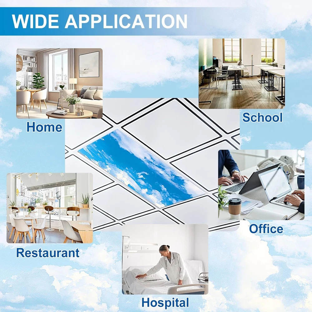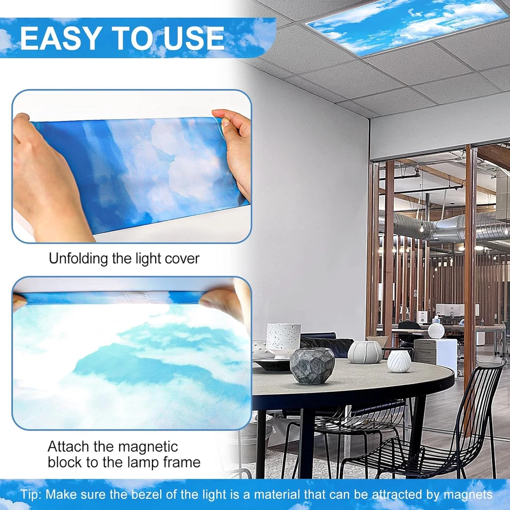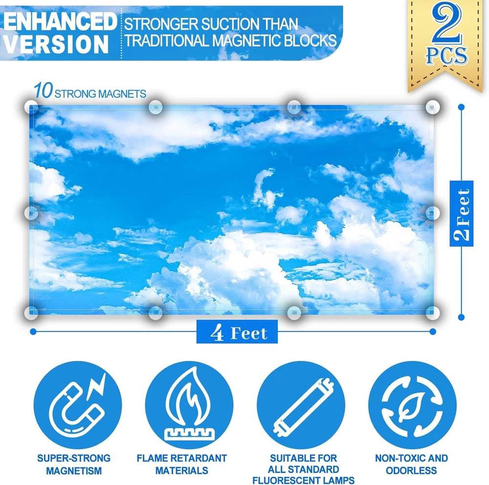 Aheroi Light Covers, 2 Pcs 4 x 2 Feet Fluorescent 2 Pack, Blue Sky 2Pcs Product Details Brand: Aheroi Color: Blue Sky 2Pcs Material: Oxford Cloth Shape: Square Special Feature: Waterproof, Foldable Product Dimensions: 48"W x 24"H Style: Modern Mounting Type: Ceiling Mount Pattern: Floral Recommended Uses For Product: Ceiling Lamp shade Included Components: 2 lampshades Item Weight: 0.28 Pounds Number of Items: 2 Number of Pieces: 2 Assembly Required: Yes Manufacturer: Aheroi Part Number: Light Covers-2 Item Weight: 4.5 ounces Item model number: Light Covers-2 Size: 2 Pack Item Package Quantity: 1 Special Features: Waterproof, Foldable Batteries Included?: No Batteries Required?: No Brand: Aheroi Color: Blue Sky 2Pcs Material: Oxford Cloth Shape: Square Special Feature: Waterproof, Foldable Product Dimensions: 48"W x 24"H Style: Modern Mounting Type: Ceiling Mount Pattern: Floral Recommended Uses For Product: Ceiling Lamp shade Magnetic Reinforcement Magnet: After rigorous market research, we found that many magnetic magnetic light covers have the problem that the magnetic block is not strong and easy to fall off, for this reason we have upgraded it with a reinforced magnetic block, the suction is stronger than other cloud light covers on the market. After many tests, there is no problem of falling off Clear pattern: Package includes 2 pieces of 2*4 feet blue sky florescent light cover, each lampshade pattern is clear, beautifully made, blue sky and white clouds reflect each other, the picture is vivid and lifelike. The light covers for ceiling lights is brightly coloured, which effectively weakens the harsh light but doesn't block out too much light, while also adding to the decor of the room Washable and Reusable: Our fluorescent light covers are made of waterproof and heat-resistant Oxford cloth, so you don't have to worry about the cloud light cover getting burned by the hot light at all, and you don't have to worry about safety. The Oxford fabric magnetic light filters also looks textured and not cheap. This ceiling covering fabric is also washable, so when the lampshade gets dirty you just need to wash it with warm water and reuse it Widely Used: Our covers for light covers for ceiling lights are easy to install, no holes or screws required, just Attach the magnets on theouter edge of the filter. The size of the light cover is suitable for most lamps, classrooms, study rooms, hospitals, lounges, dining rooms and so on. Tip: Make sure the bezel of the light is a material that can be attracted by magnets Ease Visual Fatigue: Our fluorescent ceiling light decor can effectively soften the strong light, relieve visual fatigue, release pressure and improve the efficiency of work and study. The pattern of blue sky and white clouds can also ease the tension, stimulate students' desire to learn, and effectively relieve tension and other emotions. Please feel free to contact me with any questions you may have. We are here to solve your problem within 24 hours