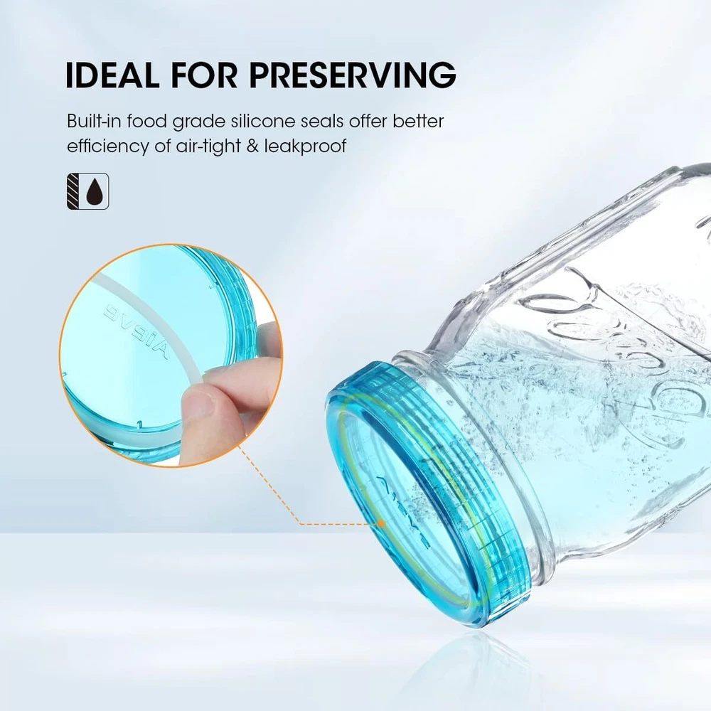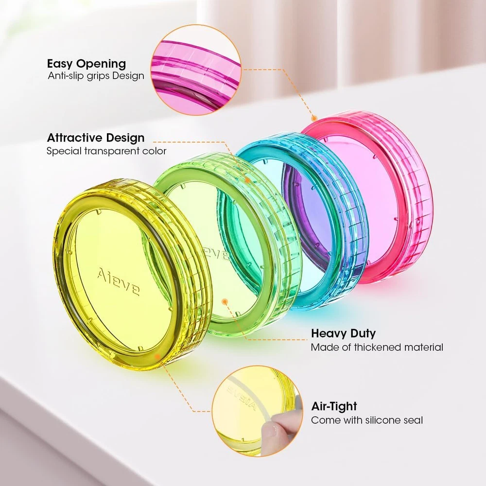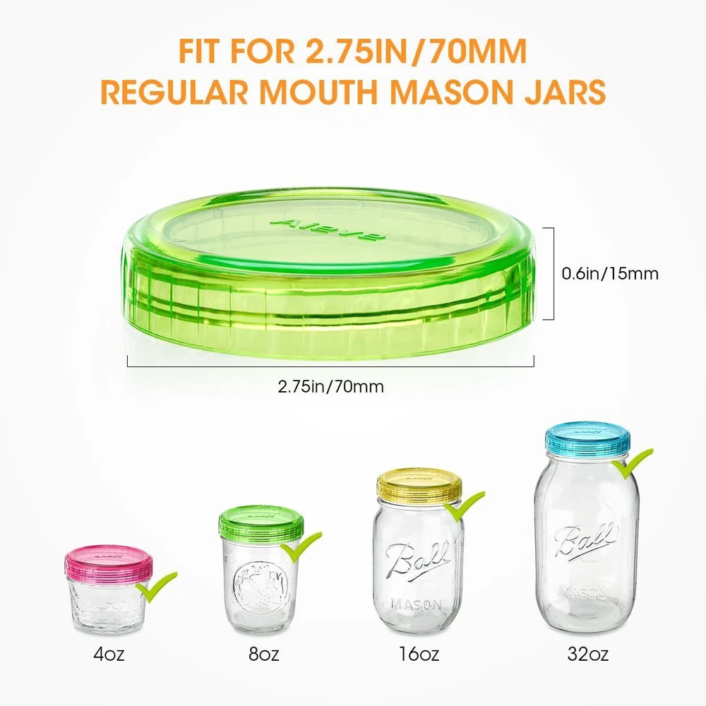 Aieve Mason Jar Lids Regular Mouth, 8 Pack Clear Green, Blue, Yellow, Pink Description Features: Lids for Mason Jars: Perfect fit for regular mouth mason jars, these beautiful regular mouth mason jar lids turn your ball, kerr mason jar into storage container. Featured with silicone seals provide effective leak-proof and airtight seal. Great for storing liquid or dry food in mason jars. Safe & Heavy Duty: Our plastic mason jar lids crafted of premium quality material, food grade, BPA-free, ordoless, reusable. Safe for kitchen storage & food prep. Made of thickened solid plastic prevent mason jar lids from deformation or crack. Beautiful Decoration: These canning lid regular mouth features unique transparent color-green, blue, yellow, pink. Not only for storage, also serves as a decorative element, creating a cozy atmosphere for your kitchen, home parties, friend gatherings, or picnics. Multifunctional: Thanks for the leak-proof design, 8 pack plastic canning jar lids are versatile for preserving jams, fruits, juice, coffee beans, grains, wheat flour in kitchen. In addition, the mason jar plastic lids can be used for home and office to storage beauty supplies, craft items, hardware and more. Long Lasting: Aieve regular mouth mason jar lids are built to last. Compare with metal canning lid, our reusable plastic mason jar lids are rust-proof, no warping and durable. Withstand up to 212℉, please do not put into dishwash or microwave. Product Details: Material: Plastic Color: Clear Green, Blue, Yellow, Pink Brand: AIEVE Style: Compact Item Weight: 0.19 Kilograms Shape: Round Number of Pieces: 8 Is Dishwasher Safe: Yes Is Microwaveable: No Manufacturer: Aieve Part Number: K0010A04 Item Weight: 6.7 ounces Package Dimensions: 4.88 x 3.11 x 3.07 inches Item model number: K0010A04 Included Components: silicone seals Batteries Included?: No Batteries Required?: No Material: Plastic Color: Clear Green, Blue, Yellow, Pink Brand: AIEVE Style: Compact Item Weight: 0.19 Kilograms Handling We will ship all orders within 3 business day of payment. Delivery We take pride in offering fast and reliable delivery for your orders! We are committed to getting your products to you as quickly as possible. Generally, we would like to inform you that all orders will be delivered to you within 1-3 business days after processing.However, in some cases, delivery times may vary depending on the buyer's location. Especially in remote or rural areas, the expected delivery time may be extended. In such situations, we do our best to ensure that your order reaches you as quickly as possible.If there are any delays, we will be happy to contact you to explain the situation. Our goal is to enhance your satisfaction with our fast delivery times. We work diligently to ensure that your order arrives safely.Trust us and enjoy our speedy delivery! Return Policy All items qualify for returns within 30 days of receipt. Buyer is responsible for return shipping on any item that is not damaged. Feedback We take our reputation seriously, we buy and sell online, so we understand the value of trust. If you are unsatisfied with your order, please contact us and we will work with you to resolve it to your satisfaction.