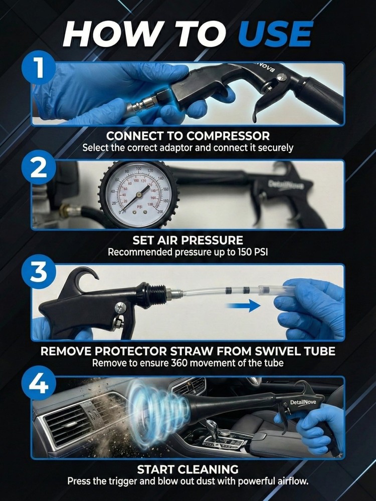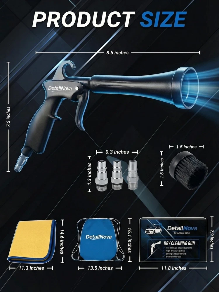 Air Blow Gun for Car Detailing - Durable Tornado Air Gun with Brush Nozzle, Storage Bag, 3 Compressor Adaptors & Microfiber Towel - Requires Compressor, Easy to Set Up Potent Air Power: The Air Gun delivers potent air power, making it a must-have air blaster gun for car enthusiasts and DIY detailers. Easily connect it to an air compressor for car detailing and experience unmatched cleaning efficiency with this air blaster for car detailing. Versatile Compressor Compatibility: Designed to fit every compressor, the Air Gun includes three compressor adaptors. This versatile air compressor gun serves as an indispensable blowout tool for drying and detailing, ensuring seamless compatibility between the air detailing tool and your setup. Comprehensive Accessory Kit: Elevate your car detailing tools and car cleaning supplies with the included brush nozzle attachment, microfiber towel, and durable storage bag. The Air Gun provides all the essential air tools for compressor use, making it a complete auto detailing supplies package for anyone looking for a detailing car kit. Durable Aluminum Alloy Construction: Crafted with a robust aluminum alloy body, this tornado air gun withstands rigorous use, providing long-lasting durability. Ideal for perfectionists, this tornado mini air tool is built to endure the demands of serious car detailing enthusiasts. Effortless Setup and Use: The Air Gun Blower is easy to set up, requiring only an air compressor. As a reliable air blower for car detailing, it simplifies your detailing routine, offering a straightforward solution for efficient and effective vehicle cleaning. The tornado car cleaning gun offers professional-grade power, establishing itself as an essential component of specialized detailing equipment for modern vehicle care. This versatile tool is built to elevate your performance beyond standard auto detailing tools, providing deep cleaning capability in challenging, hard-to-reach areas of the car interior and exterior. Professional-grade Performance Engineered for consistent, heavy-duty use, this advanced car detailing air gun features a durable, heavy-duty aluminum alloy construction. This material choice ensures longevity, making this air blow gun a reliable choice. Whether you refer to it as an air pressure gun or a dedicated high pressure cleaning gun, its robust build guarantees consistent results, making it a great detail air gun for serious enthusiasts and professionals alike. Full Compressor Compatibility and Required Setup Please note: This specialized cleaning device is designed as an air compressor air gun accessory and requires an external air compressor system for operation. It connects effortlessly to standard air systems, functioning ideally as a high-efficiency air blower for compressor applications between 60–150 PSI. The kit includes universal adaptors and is optimized to work as a comprehensive car detailing air compressor attachment. Utilize this system as your primary air compressor detailing tool, featuring an upgraded air compressor blower nozzle designed for maximum air flow. Ultimate Versatility and Deep Cleaning Action The unique vortex technology inside this professional tornado gun for detailing converts compressed air into a powerful, swirling stream, effectively transforming it into a formidable blow out tool for dislodging embedded grime. Maximize your cleaning options with the inclusion of two interchangeable nozzles, allowing this powerful detailing blow gun to adapt to various surfaces. Use the focused air stream as a dedicated dust removing gun for tight console areas, or switch to the wider output to use it as a powerful car detailing blower for carpets and seats. This dual functionality ensures it serves efficiently as a versatile air blower gun for car detailing and a heavy-duty car detail air blower gun. This high-performance system is often sought out as a reliable air compressor gun blower or air compressor blower and is designed to tackle everything from fine particulate removal to deep carpet extraction. The impressive power and vortex efficiency of this tool, also known as the tornado dry cleaning gun, allows it to deliver amazing results for your car detailing equipment needs. For those requiring extreme cleaning, this tool functions as a robust air gun and high-velocity detailing air blower. Its impressive output makes it a favored air tool for car detailing, and its powerful cleaning action provides deep and effective results. The innovative technology ensures great quality and high performance, delivering a strong air flow for superior cleaning. Finally, keep your complete set of detailing tools and accessories securely protected and highly portable with the included storage bag. Whether you use it as a reliable car detail blower or a heavy-duty car detailing blower gun, this convenient addition ensures you always have a ready-to-go air compressor attachments for car detailing kit. The vortex tornado gun delivers reliable results every time, making it a strong choice for achieving a truly clean finish. Shipping We offer FREE shipping on all orders! We ship within Three business days of payment, usually sooner. We use a selection of shipping services such as UPS, FedEx, USPS etc. We only ship to the lower 48 states, no APO/FPO addresses or PO Boxes allowed. Local pickups and combined shipping options are not provided at this time. Return You can return a product for up to 30 days from the date you purchased it. Any product you return must be in the same condition you received it and in the original packaging. Please keep the receipt. Payment We accept payment by any of the following methods: PayPal Please pay as soon as possible after winning an auction, as that will allow us to post your item to you sooner! Feedback Customer satisfaction is very important to us. If you have any problem with your order, please contact us and we will do our best to make you satisfied. Contact Us If you have any quer