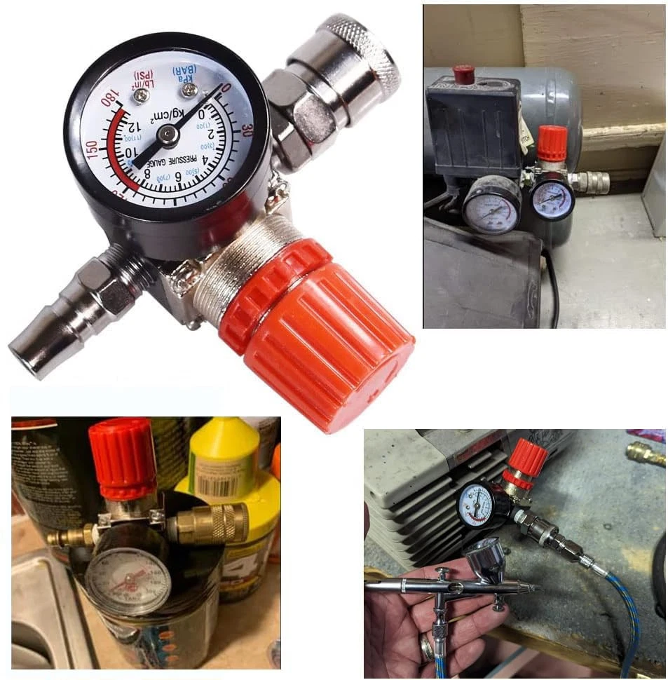 Air compressor pressure regulator with dial indicator, Four way valve : maximum voltage: 240 V; Maximum current: 15A; Maximum pressure: 175 PSI, 12 BAR. Materials and characteristics: plastic, alloy and copper. Easy to install and remove, with thread locking agent, better sealing Four way valve : maximum voltage: 240 V; Maximum current: 15A; Maximum pressure: 175 PSI, 12 BAR The data can be set and read using the barometer. With valve knob, you can adjust the atmospheric pressure as required. In use, it can help save electricity The air compressor pressure regulator is used to connect the air compressor or air pipe, regulate the air pressure Our air compressor regulator has a high cost performance ratio and is a pneumatic tool worth choosing for daily use of air compressors