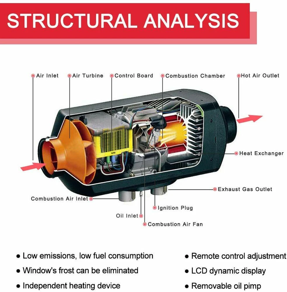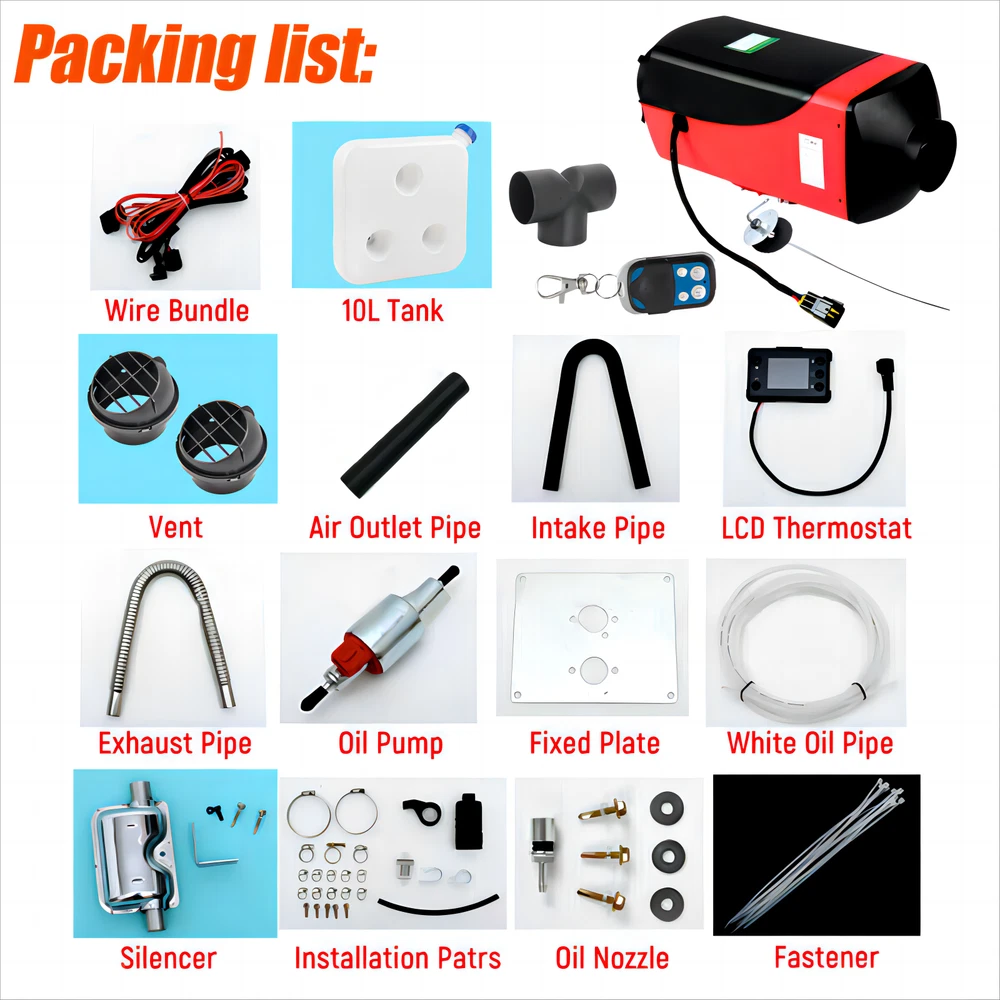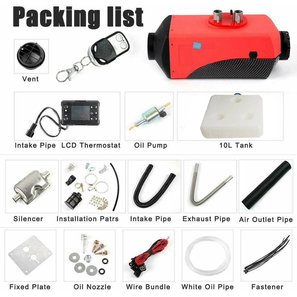 Product Description The air diesel heater can be used for truck, boat, car trailer, motorhomes, touring car, campervans, caravans and all kinds of other diesel vehicles. Diesel air heater is also suitable for indoor use, such as for home, warehouse, factory, office, etc. Tips: The smaller the space, the faster the warmth. If the space is large, it is recommended to buy a few more heaters to heat it. Remote control can Preheating, oil quantity, temperature and wind speed can be adjusted, window's frost can be eliminated. Environmentally air diesel heater, low emissions, low fuel consumption. NOTE: The remote control needs to be set before it can be used. You can see the steps in the Product Description. Compact structure, easy to install. When the vehicle is replaced, it can be disassembled to the new car. The LCD dynamic display will clearly show the running state of the machine. Fuel, electricity, temperature can be set arbitrarily. The engine coolant can be preheated to avoid engine wear and tear at low temperatures. Volatile technology, by the ceramic ignition plug will fuel heating evaporated into gas, fast ignition, full combustion. Specification: Heater power: 8KW Fuel gasoline: diesel Car air conditioning type: Heating Rated voltage: 12V Working temperature of the heater: -40℃~+50℃ Working temperature of the oil pump: -40℃~+40℃ Item Size: about 15.3" x 5.7" x 5.7" inch (As picture shows) Features: The air diesel heater can be used for truck, boat, car trailer, motorhomes, touring car, campervans, caravans and all kinds of other diesel vehicles. Environmentally air diesel heater, low emissions, low fuel consumption. Remote control can Preheating, oil quantity, temperature and wind speed can be adjusted, window's frost can be eliminated. Compact structure, easy to install. When the vehicle is replaced, it can be disassembled to the new car. Fuel, electricity, temperature can be set arbitrarily. The LCD dynamic display will clearly show the running state of the machine. The engine coolant can be preheated to avoid engine wear and tear at low temperatures. Volatile technology, by the ceramic ignition plug will fuel heating evaporated into gas, fast ignition, full combustion. Full kit includes everything needed for standard installation. (As picture shows) Package Included: 1 x Air Heater 1 x Silencer 1 x LCD screen 1 x Remote Control 1 x Tank(10L) 1 x Wire Bundle 1 x Vent 1 x Air Outlet Pipe 1 x Intake Pipe 1 x Exhaust Pipe 1 x Oil Pump 1 x Fixed Plate 1 x White Oil Pipe 1 x Oil Nozzle 1 x Fastener 1 x Installation Kit Note: Since it is a manual measurement, please allow an error of 1-3 cm. Picture is slightly different in color, which mainly lies in different light effect and computer monitor. The remote control needs to be set before it can be used. Please follow the steps below: 1. With the air heater stopped working, press the "▲" button and keep pressing until the "HFR" appears on the screen. 2. When the "HFR" appears on the screen, press the unlock button on the remote control, and then press the "ok" button. 3. Note: The above steps can only be performed if the air heater is stopped. Any question please email to us. Tip: It is normal for the machine to fail to ignite the first time . Please wait patiently. restart the machine after the machine stops , wait for a few minutes and do not press the key. when the oil pump works, it will be accompanied by ignition. if the ignition is successful, hot air will be emitted in 3 minutes. Remote control batteries not included!