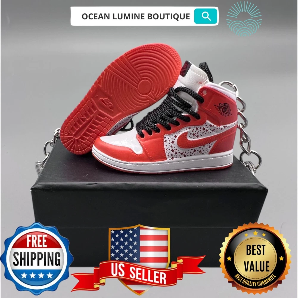 PLEASE READ BEFORE YOU PURCHASE This is the best quality you can get, many other cheaper ones have poor quality, I know all the factories trust me, some really be making crap and you can not tell from the pictures. Handcrafted and hand-painted 3D Mini Sneaker Keychains inspired some of the most coveted sneakers ever produced Materials as ABS Plastic (Soft Plastic) Jordan pin color will be given randomly (If chosen) All Shoe keychain size is about 2 1/2 (L) x 1" (W) x 2" (H) The shoe Tongue is movable, it is not cracked or broken. Random shoe box styles will be given, if you have a preference please get in touch with me. These are all handmade and hand-painted with better paint, if you want to find a lower price please seek lower quality, my key chains are the best quality you can find. We've been selling these key chains for 3+ years, and have the most styles & best quality with super fast shipping. Search OCEAN LUMINE BOUTIQUE on any search engine to visit us! CLICK ME FOR MORE STYLES Disclaimer Product packaging, specifications, and prices are subject to change without notice. All information about the products is provided for information purposes only. Please always read labels, warnings, and directions provided with the product before use. Shipping We will ship all orders within 2 business days of payment, we provide free upgrade USPS shipping service up to 2-DAY Priority if Urgent Contact We can be contacted at any time through eBay messages if you have any questions, comments or product requests. We will respond to you within 24 hours and do our best to help you out! Features and further details 3000+ keychains in stock with up to 400+ styles We do bulk orders with discounts and provide long-term business relationships More styles are available in my shop PP WORLD