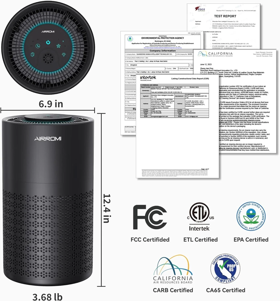 đăSuper Purificationă: Our Size: 6.9"D x 6.9"W x 12.4"H, though this portable air purifier is compact, it can generates more than 673.6gal/2550L clean air /min. AIRROMI A2001 bedroom air purifier utilizes 2023 newly advanced filter system: 40 ppi pre-filter, True HEPA filter, and activated carbon filter. This combination effectively captures 99.97% of particles as small as 0.3 microns, including pet dander, hair,pollen, smoke, Kitchenodors, dust and Mold Smoke . AIRROMI A2001 Air Purifier just want to help you to breath the cleaner air. đă360° Effective Purificationă:Thanks to a large air intake at the bottom, AIRROMI air purifiers has a 360° air intake, so air will enter from all directions, create a effective purification. Btw, A2001 Air Purifier air purifier produces clean air up can coverage up to 990 square inches room.ïŒDifferent countries have different formulas for calculating area. It means it can cover up two small rooms or one large room.) When you need to replace it, you will be shocked at how strong the adsorption capacity of the old filter. đăWidely UseăïŒA 18W energy-saving long-life motor suitable for everyone. If you are a pet owner, I guess we can meet your require, cause this purifier can effectively absorb cat litter smell or dog hair, Btw, after cooking, you don't need to open the window, the purifier will help you to clean the air. And it also good for smokers, babies or children, and suitable for living rooms, bedroom, dorm, kitchen, office,classroomsïŒnursery or apartment. đ§ăEasy to Use & with HEPA Filter Replacement Alarmă:AIRROMI air purifiers are easy to install with a concise instruction manual. And when the air purifier needs to be replaced, the button of the screen will flash a yellow light to remind you. You just need to hold down the button for 3-5s, then replace the filter.The replacement HEPA filter should be replaced every 3-6 months depending on the environment and usage frequency. And purifier must match original filters, or it might be damage. Filters search for ASIN B0C4P3XCP6 on Amazon. đșăAromatherapy Air Purifieră: AIRROMI air purifier features aromatherapy functionality, allowing you to use essential oils on the aromatherapy pad at the top of the purifier. Try dripping fragrances onto the pad start with 5-6 drops, then add 3-4 drops after an hour to gradually release the aroma absorbed by the pad. Note: Different oils may produce varying effects based on their scents. đăAir Purifier Quiet & Earned the Certifiedă:The noise level of the hepa filter air purifiers is as low as 23 dB, is as silent as your own breath, ensuring a peaceful and undisturbed environment while still providing effective purification. And you don't need to worry about the quality of the product, all of our materials are carefully selected, and the air purifier has also undergone multiple quality tests, which earned the certified of CARB/EPA/ETL/CA65/FCC. â°ăHome Air Cleaner with Sleep Mode - Turn On/Off Night Light, 3 Timers, 3 Wind Speedsă: When you go to sleep, you can choose 1/2/3 wind speeds according to your prefer. And you can also choose the hepa air purifier timer if you need it, our timer has 3 modes: 2H 4H 8H. If you need a night light, the energy-saving lights of AIRROMI bedroom air purifier can be left on all night, which is a comfortable light, and of course, you can choose to turn off, depending on your personal preferences and needs. đăExcellent Designă: According to carefully designed, AIRROMI air purifier has a high-end appearance, this is the first use in the air purifiers industry, we've achieved a dipped and brushed metal texture on appearance, giving the air purifiers a stylish and sophisticated look. Almost everyone will marvel at this portable air purifier. Product Description AIRROMI A2001 Pets Filter Yellow AIRROMI A2001 Original Filter White AIRROMI A2001 Smoke Filter Blue AIRROMI A2001 Air Purifier Add to Cart Add to Cart Add to Cart Add to Cart Add to Cart Add to Cart Add to Cart Customer Reviews 4.5 out of 5 stars 3,087 4.5 out of 5 stars 3,087 4.5 out of 5 stars 3,087 4.5 out of 5 stars 3,087 4.5 out of 5 stars 3,087 4.7 out of 5 stars 434 4.4 out of 5 stars 285 Price $59.99 $ 59 . 99 $59.99 $ 59 . 99 $59.99 $ 59 . 99 $59.99 $ 59 . 99 $59.99 $ 59 . 99 $19.99 $ 19 . 99 $39.99 $ 39 . 99 Color Pearlescent White Profound Black Vibrant Orange Elegant Green Literary Purple Pearlescent White Pearlescent Black Item Dimensions 6.9*6.9*12.4 inches 6.9*6.9*12.4 inches 6.9*6.9*12.4 inches 6.9*6.9*12.4 inches 6.9*6.9*12.4 inches 6.5*6.5*6.5 inches 6.3*6.3*10.63 inches Weight 3.68 Pounds 3.68 Pounds 3.68 Pounds 3.68 Pounds 3.68 Pounds 260 Grams 2.61 Pounds Coverage Area Up to 990 sq.ft Up to 990 sq.ft Up to 990 sq.ft Up to 990 sq.ft Up to 990 sq.ft Up to 990 sq.ft Up to 765 sq.ft Filtering System HEPA original filter HEPA original filter HEPA original filter HEPA original filter HEPA original filter HEPA original filter Activated Carbon & HEPA Application Home/ Office Home/ Office Home/ Office Home/ Office Home/ Office Home/ Office Home/ Office