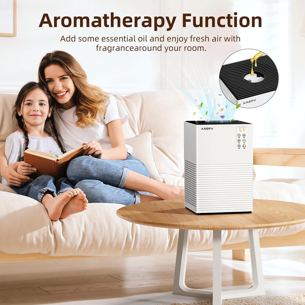 air purifier for home large room Up to 1200 Sq Ft, H13 filter air purifier with 3 fan speeds, 4 timer, child lock, air quality sensor, aromatherapy design. air cleaner for pet hair & odor, pet dander, pollen, smoke, wildfire. It is perfect fits in various room like bedrooms, living rooms, offices, nurseries, basements and kitchens. It is perfect for pet owners, babies, children, the elderly, or anyone wanting to improve the air quality in their home.Its exquisite design and efficient purification capacity is are very suitable for pet families, but also as a gift for friends and family 【Clean Air in Minute】This high efficiency air purifier for home can cleans off 99.7% of dust, pollen, smoke, wildfire and pet dander. This large room air purifiers coverage area up to 1200 sq ft, fits in various room like bedrooms, living rooms, offices, nurseries, basements and kitchens. It is perfect for pet owners, babies, children, the elderly, or anyone wanting to improve the air quality in their home.( The power cord and filter of this product are placed inside the product) 【Real-Time Air Quality Sensor】This air purifier for home large room is equipped with real-time air quality sensor to detect air quality, you can judge the air quality by the change of the light color inside the machine.(Green is food, blue is minor pollution, red is severe pollution)Note: The air purifier is in the preheating state after power on, and the indicator light will continue to flash for one minute 【3 Fan Speeds & 4 Timer】The hepa air purifier has 3 adjustable fan speeds(L1 L2 L3)you can set the suitable fan speeds to meet your daily needs. Besides, the bedroom air purifier comes with 4 timer, which are 2h 4h 8h 12h, you can set air purifier use time to save your bill when you are sleeping or go out 【Child Lock & Quiet Air Purifier】When the pet odor&hair air purifier for bedroom is operating in sleep mode, our air purifier for basement fan operates at low noise(less than 15dB) and screen turns off automatically after one minute. The hepa air purifier also has considerate child lock design can prevent your baby from being injured and prevent accidental touching and arbitrary changes in settings. Note: The L1 or auto speed is recommended to use when sleeping 【Filter Reset Reminder & Aromatherapy Design】Struggling with worst smells? Add a few drops of your favorite fragrant essential oils (Not Included) to the aroma pad to keep your space smelling great. When the H13 hepa air purifier is used for more than 2160 hours, the light will flashes, prompting you to replace the filter(The official filter can be purchased on by searching B0DK574MDG)