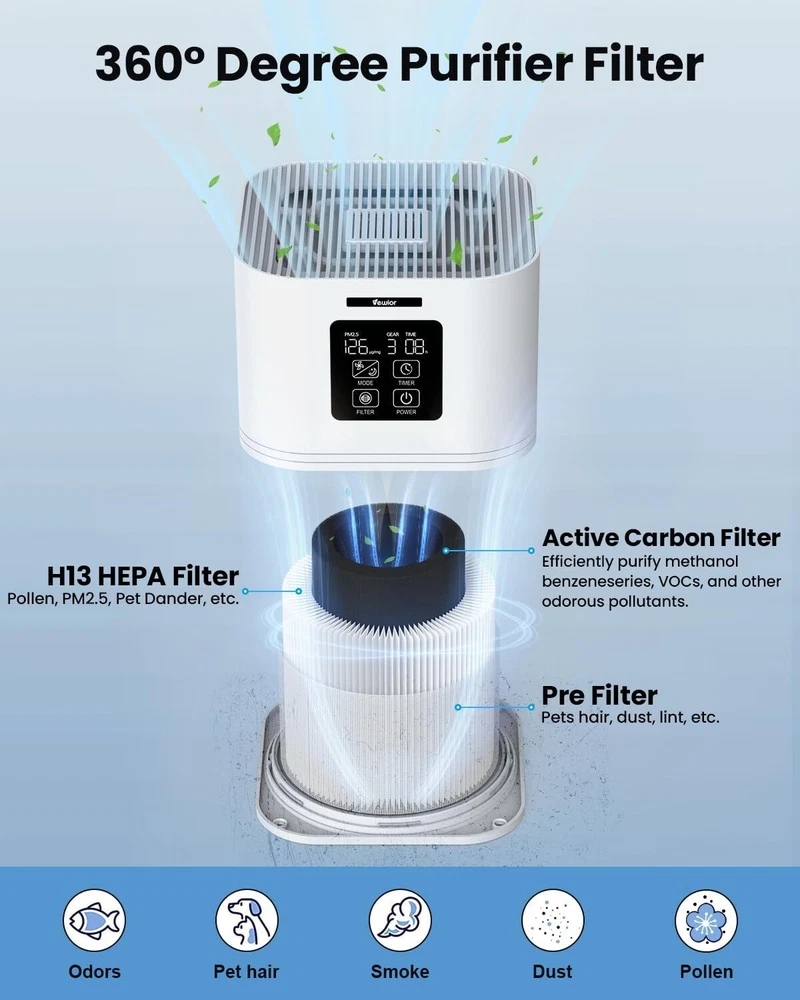 Product Description Air Purifiers for Home, HEPA Air Purifiers for Large Room up to 600 sq.ft, H13 True HEPA Air Filter with Fragrance Sponge 6 Timers Quiet Air Cleaner for Pets Dander Odor Dust Smoke Pollen Efficient Purification: Air filter consists of pre-filter, HEPA filter, and activated carbon filter, which can effectively purify air pollutants such as smoke, PM 2.5, VOC, pollen, pet dander, etc. Help you improve air quality and care for the respiratory health of your family. PM2.5 Detection: Visualize air quality. air purifiers use the latest technology built-in chip can detect the change of air quality around the air purifier in real time. The lower the value, the better the air quality. 4 Purification Modes: Home air purifier has 1-2-3 gear and sleep mode. The higher the level, the greater the purification wind speed and the faster the purification speed. Sleep mode is very quiet and the display will turn off, so you can enjoy fresh air as you sleep sweetly. Filter Reminder: New function! When the filter has reached the end of its service life, "FILTER" will light up red and remind you that it needs to be replaced. You just need to press and hold the "FILTER" button for 3-5 seconds, and the red reminder will disappear. Please use the official "" Filter to get the best purification. Aromatherapy Diffuser: Unique fragrance diffusing air purifier. There is an aromatherapy cotton pad on the top, you can drop your favorite essential oils into the cotton pad, and with the 360°cycle purification of the air purifier, the fragrance will spread to the whole room. About Us We are a reputable seller with many years of experience selling on eBay. Our goal is to provide high-quality products and excellent customer service. Shipping Items will be shipped within 1-3 business days when we received payment. (Orders are not processed on weekends & holidays) Tracking information will be sent once item is shipped. Delivery time depends on destination and other factors Item is shipped to ebay address. Leaving correct address can minimize delay. For international shipping and shipping to Guam, Hawaii and Alaska, Please contact us before placing the order. International buyers please note: Import duties, taxes and charges are not included in the item price or shipping charges. These charges are buyer’s responsibility. We will try our best to reduce the risk of the custom duties. Local pick-up is unavailable at the moment. Contact Us We reply any email messages within 1 business / working days(off-duty at weekend). If you do not get a response from us, then please check your junk or spam mailbox. Our Business hours: Mon-Fri 9:00-18:00, UTC/GMT +8 hours. Please contact us either by clicking "contact seller" in the "purchase history" section or simply click "ask a question" at the bottom of this page. If you are unsatisfied with our item or service, please contact us before leaving any feedback. We are committed to resolve all issues in a friendly and satisfactory manner.