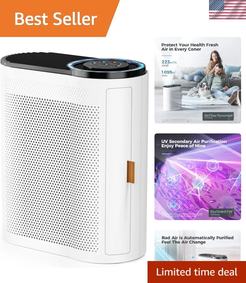 Air Purifiers for Home Large Room Up to 1095 Coverage with Air Quality Sensors Impressive Filter Layer with Auto Function for Home, Bedroom, - WhiteAvailable for California Impressive Filtration: Equipped with a impressive filtration system, our air cleaner can filter particles in the air. When you turn on the air purifier, it can refresh the air in a room as large as 1095 sq ft / 100 m² every hour, providing you with a new and comfortable air environment throughout the day in your home or office. Dual Air Treatment: Our air purifier not only uses impressive purification filter to capture particles, but also features a light treatment technology to further purify the air. With this dual treatment system, we provide more comprehensive air purification, ensuring a healthier living environment for you and your family. (Note: The function is turned off by default, please turn it on to maximize the air purifier's performance.) Feel The Air Change: Our air purifier comes equipped with a built-in sensor, so you don't have to play the guessing game with your nose. When the air quality drops, our purifier will go into action and the indicator will turn yellow or red, and the fan will speed up to clean the air faster. Trust us, your lungs will thank you for the break from the dirty air. Your Silent Companion: you hear that? No, it's not the sound of silence, it's the sound of our air purifier in sleep mode! With low noise and low speed, it's the perfect companion for a good night's sleep. It will not disturb your sweet sleep, and even a light sleep baby can enjoy the comfortable air on a quiet night. Filter Made Easy: Say goodbye to the hassle of replacing air filters. Our air purifier makes it a breeze! Simply open the filter cover, grab the rope on the side, and voila! You can easily take out or replace the filter inside. We recommend replacing the air filter every 3-6 s to ensure optimal air purification. (Pro tip: For best results, always use the official filter!)