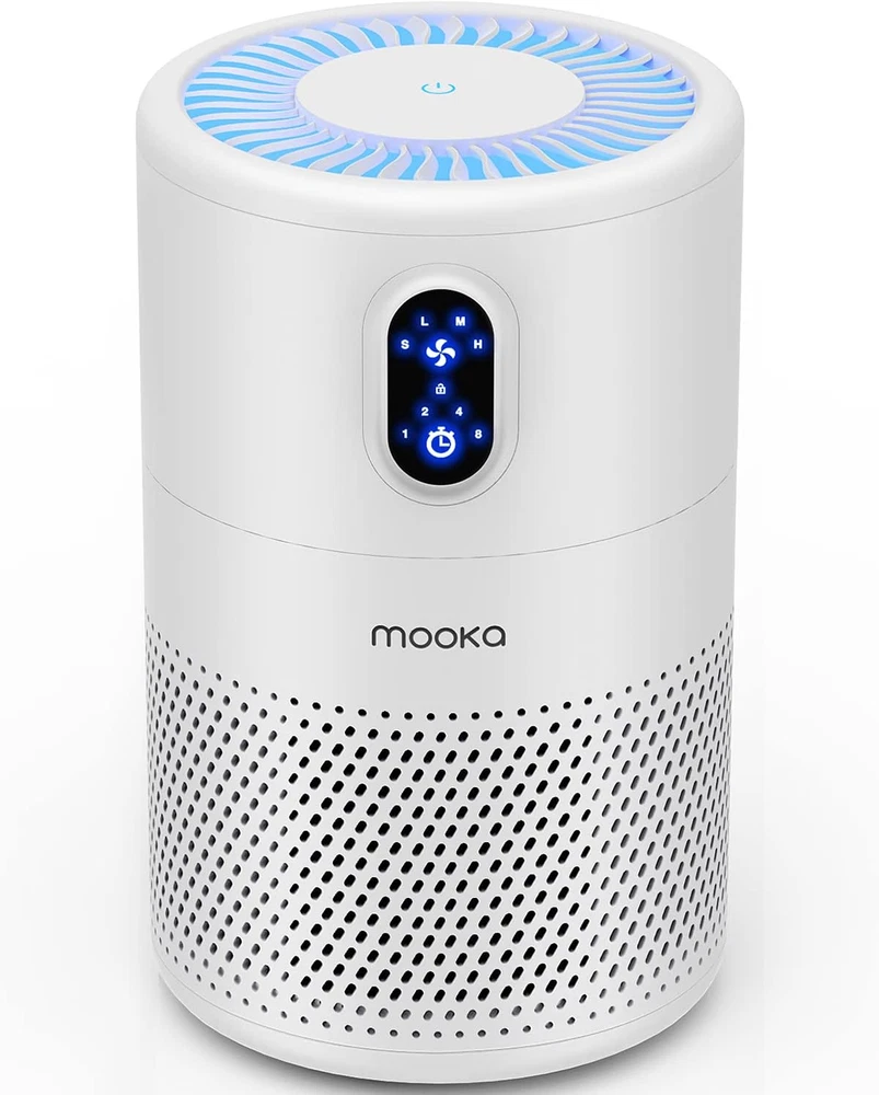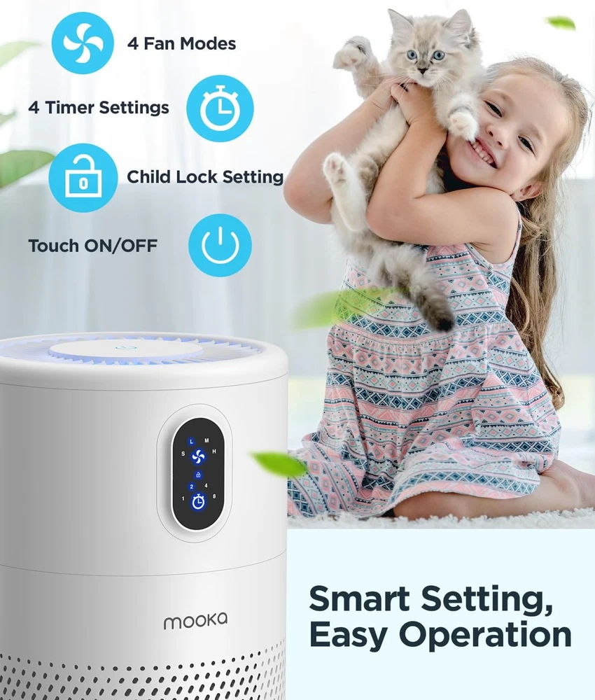 MOOKA B-D02L AIR PURIFIER FOR LARGE ROOM: With the high-efficiency filtration system, the air purifier covers an area up to 1076 ft². 6 air changes per hour in 215 ft², 1 air changes per hour in 1076 ft². Modern design fits in any space from small to large rooms, bedrooms, living rooms, offices, nurseries, kitchens and basements. Perfect for pet owners, babies, children, the elderly, or anyone wanting to improve the air quality H13 TRUE HEPA AIR PURIFIER: The pre-filter, H13 true HEPA filter and high-efficiency activated carbon filter capture pet hair, dander, smoke, odor, and large dust particles, in addition to removing all airborne contaminants as small as 0.3 microns ULTRA-QUIET, ENERGY-SAVING & SAFE: Thanks to the new brushless motor, the 20dB noise level is almost voiceless. It cleans your air, doesn't affect your work, study or sleep. Running in low power makes it extremely energy-saving. Child lock prevents error operations caused by pets or children. The replacement filter should be replaced every 3-6 months depending on the environment and usage frequency (Search for B08PK4WM4W) 4 TIMER SETTINGS, 4 FAN MODES, AND NIGHT LIGHT: 4 timer options (1H/2H/4H/8H) allow you set the air purifier operating time. Adjust the required fan speed mode (Sleep/Low/Med/High) to capture as much air pollutants as required. Soft night light, that prevents falls, can be turned off to enjoy the perfect dreaming. Press the top power button for 3 seconds to turn ON/OFF the night light when the machine is running EXCELLENT CUSTOMER SERVICE: We love our customers and take pride in providing a pleasant shopping experience. If you have any questions, please contact us. Note:1.The power adapter is placed with the filter, please open the bottom base cover to find it.2.Please remove the new filter plastic bag before running the air purifier Product Description Get to Know More About Mooka Air Purifers Add to Cart Add to Cart Add to Cart Add to Cart Add to Cart Customer Reviews 4.5 out of 5 stars 5,804 4.5 out of 5 stars 5,804 3.0 out of 5 stars 1 4.7 out of 5 stars 1,165 4.7 out of 5 stars 1,165 Price $55.24 $ 55 . 24 $59.99 $ 59 . 99 $29.99 $ 29 . 99 $29.99 $ 29 . 99 $49.99 $ 49 . 99 Product Dimensions 7.1x 7.1 x 11.1 inches 7.1x 7.1 x 11.1 inches 5.5x 5.5 x 5.9 inches 5.5x 5.5 x 5.9 inches 5.5x 5.5 x 11.8 inches Package 1 Pack 1 Pack 1 Pack 1 Pack 2 Pack Effective Area 1076 sq ft 1076 sq ft 1076 sq ft 1076 sq ft 1076 sq ft HEPA Filter H13 HEPA H13 HEPA H13 HEPA H13 HEPA H13 HEPA Filter Lifespan 3-6 months 3-6 months 3-6 months 3-6 months 3-6 months MOOKA Air Purifier is Ideal for Your Family. Let Your Family Breathe Easily! Millions of people struggle with air pollution everyday! Wildfire Smoke Pet Dander Pollen Dust Smoke from Canada Wildfires Travels Across US to New York,the unhealthy air quality caused by smoke makes PM 2.5 skyrocketed, which gets into your respiration system. Wildfire smoke can be especially harmful to the health of elderly, pregnant,children. Choose Mooka HEPA air purifiers for home, Choose what you breathe in every day.Mooka B-D02L air purifier has been certified by California Air Resources Board and is available for California residents. 1 1/2/4/8 H Timer 2 4 Fan Speeds 3 Quiet Sleep Mode 4 Child Lock Air purifier covers up to 1076 ft² with high efficiency filtration system! 1 Energy Saving 2 DC 100-240V 3 Best Present