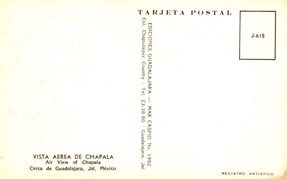 Aerial view postcard of Chapala near Guadalajara, showing the beauty of the area. Published by Ediciones Guadalajara.