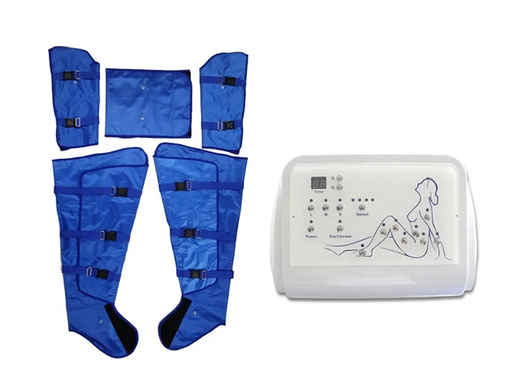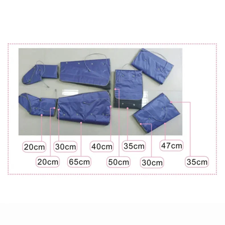Lymphatic Drainage Vacuum Therapy Pressotherapy Machine The lymphatic detoxification slimming machine is known as the human body "scavenger", mainly within the circulatory system of the human body. The inner recycle including: the blood circulatory system, the lymphatic circulatory system and tissue fluid, etc. The air inflation by the air bag tie customers' abdomen, arms, legs lymphatic at inflated circulation to a certain period of time and deflated, prompting within the circulatory system to speed up the cycle in the human body, in order to achieve detoxification slimming, endocrine regulation. How to work? 1. 3 different levels for air pressure power for your choice 2. 4 different modes for the treatment. 3. From left to right: First three mode is automatic mode, and forth mode is manual mode: 1) Air flow: foot-legs-waist-arms. Inflate and release the first airbag, and then the next one. 2) Air flow: foot-legs-waist-arms. Inflate and release the first airbag, and then the next one. After 3 times, inflate all the airbags togther. 3) Air flow: foot-legs-waist-arms. The first airbag does not release air pressure when inflate the next one, so all the airbag keep inflated once finished. Pressotherapy The pressotherapy, with a set of cloth-like accessory and 8 pieces of air bags, which allows for pressure by cycles or all-together for both the whole body and certain parts of the body, is a compression system designed to increase the venous and lymphatic flow and enhance extra-cellular fluid clearance. It is highly recommended for the treatment of cellulite, which is a safe alternative to liposuction. It relieves pain and swelling, and provides immediate comfort. It redefines the legs, stomach and arms while enhancing skin tone.