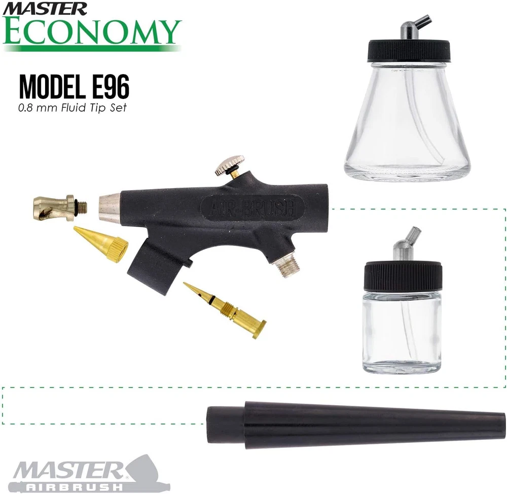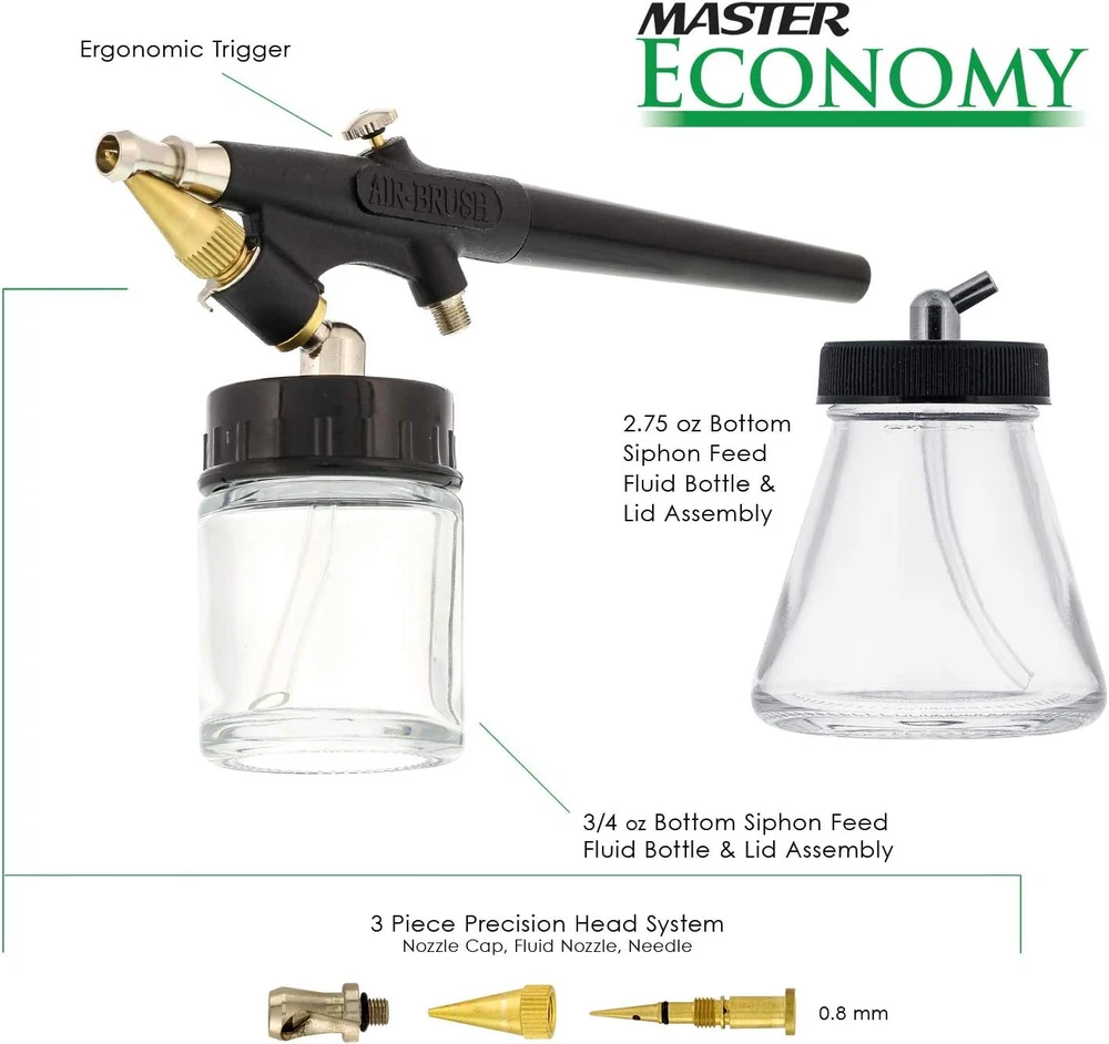 Airbrush Set-Kit-Single Action-Siphon Feed-External Mix-Sunless Tanning Great Starter Airbrush Kit for Beginners, Students, Handymen, Hobbyists, and Do-It-Yourselfers! Single Action, Bottom Feed, External Mix Airbrush with a 0.5mm Needle and a Broad Spray Pattern Includes: 2 oz and 3/4 oz Siphon Feed Fluid Bottles, 5' Plastic Hose, Propellant Regulator w/Adapter Spray & Color Media: Watercolors, Acrylics, Inks and Dyes, Automotive Urethanes, Lacquers & Enamels Common Applications: General Airbrushing, Hobbies, Crafts, Models, Signs, Backgrounds, T-Shirts, RCs