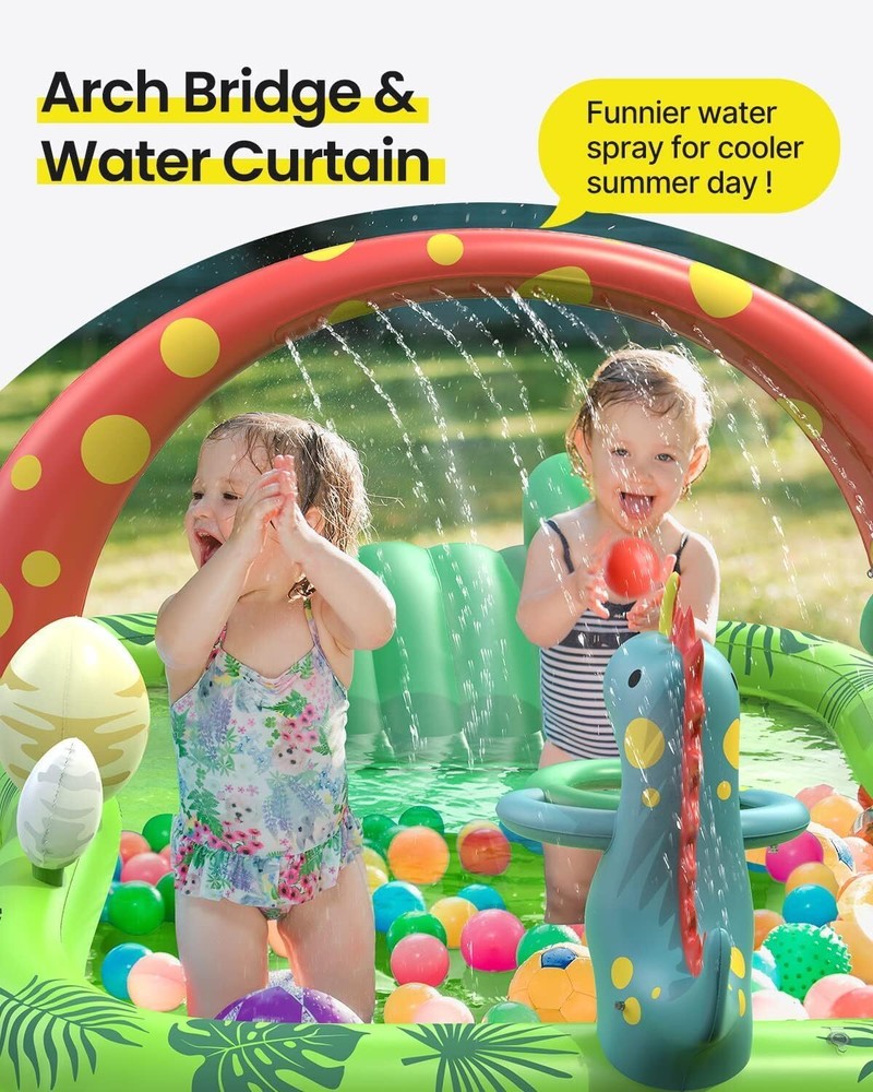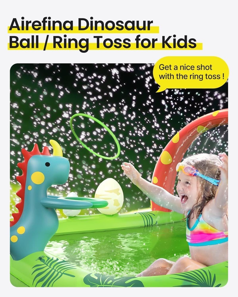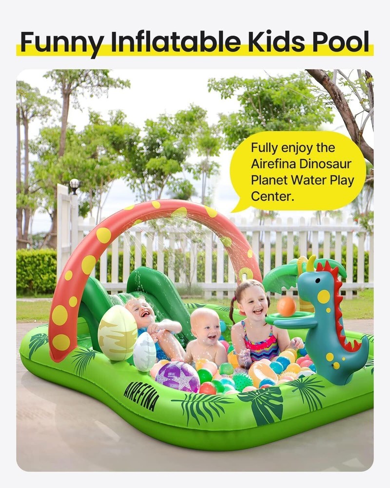 Inflatable Kids Pool, Airefina Dino Planet Inflatable Play Center Kiddie Pool with Water Slide, Ultra Thick 97"x76"x41" Toddler Pool with Play Ball Hoop, for Backyard, Garden, Water Park, Ages 3+ Item Description About this item Enhanced Safety: Airefina develops the product by keeping safety for kids in mind at all times. The arc of the kiddie pool was made with thickened 0.42mm where the slide reached 0.45mm to reduce the risk of puncture. What's more, a soft padded landing mat at the bottom part of the pool for comfort. Summertime Fun at Home: Inspired by the jungle adventure theme, the inflatable pool boasts kids’ favorite water slide design. Let your kids enjoy playtime in your own backyard without trekking to the beach or water park. Tailored for kids aged 3 years old and above: The Airefina Children's Pool features a Jurassic water slide, a cretaceous coconut tree, a beastly dinosaur hoop, and a roaring tunnel sprinkler in vibrant colors to enhance the fun of playing and children's imagination. Easy to Set Up: All parts are seamlessly connected to the whole kiddie pool. Inflate them one by one with a manual pump or an 0.5psi/0.034bar electric pump (not included) in a few minutes. Afterward, connect your garden water tap to the arch and add water to the pool. Easy to Deflate & Store: Equipped with a drainage valve to empty the pool quickly. Can be easily deflated and folded and stowed in your car's trunk or storage box. An ideal choice as a children's birthday gift, a holiday gift, a beach party toy, and more. › See more product details Our range of quality inflatable products turns the little moments in life into memorable experiences. So all you need to do is focus on enjoying the moment! We are committed to creating the best lifestyle inflatables on the market. We strive to achieve this from the early planning stages right down to the production of high-standard goods. This is part of our dedication to bringing premium quality experiences that are comfortable, affordable, and made to last. Turn your backyard into an exclusive mini water park for your kids and let them enjoy hours of refreshing summer fun with this all-in-one dino planet inflatable play center! Thickness: 0.01inch/0.4mm(Overall), 0.02inch/0.45mm(Water slide) Made from thickened 0.45mm PVC to provide better support and extended service life. Designed with exclusive handrails to prevent children from accidentally falling from the side. The water sprinkler arch of the kid’s pool features a semi-circular design. Simply connect the water pipe and fill in the arch with water for your kids’ cool and fun summertime. Have a family game by throwing rings on the dinosaur eggs or balls on the dinosaur hoop. Increase the fun of playing while enhancing kids’ abilities such as concentration, hand-eye coordination, and color recognition. Payment We accept payment only through PAYPAL Shipping We ship products worldwide through standard express courier service, it will reach within 7 to 10 days to abroad buyers, we ship the product after recieved clear payment and give full information about shipment to the buyer Return We accept product return within 7 to 21 days from delivery date but product should be in original position and not in damaged condition,the return shipping charges will be buyer responsibility