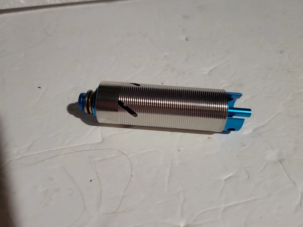Listing is for a entire v2 gearbox upgrade set The set Includes - Cnc stainless steel ribbed cylinder, ported for 70% volume Cnc Aluminum 8 port ball bearing piston head Cnc Aluminum double o ring flat faced cylinder head Should be compatible with most jg/TM spec v2 gearboxes