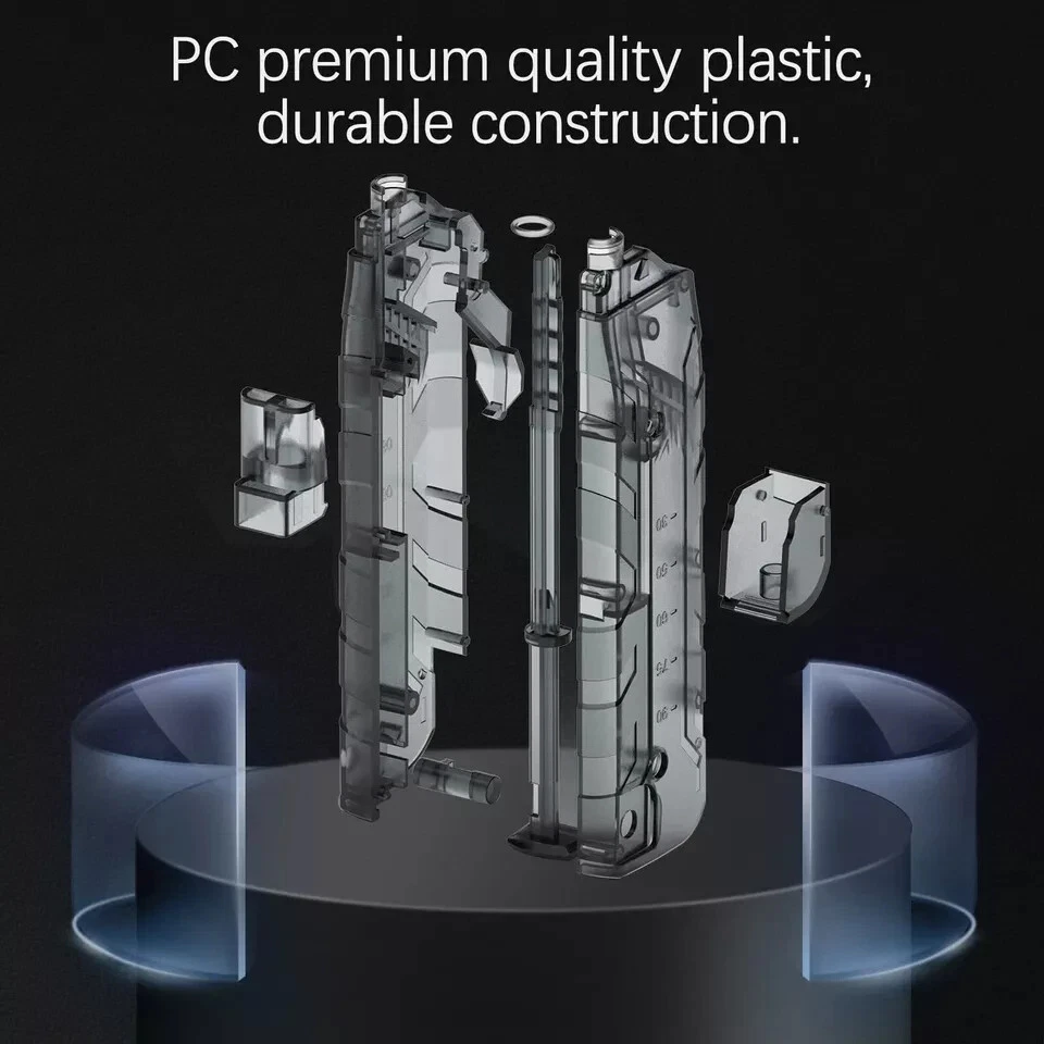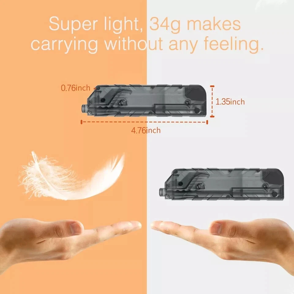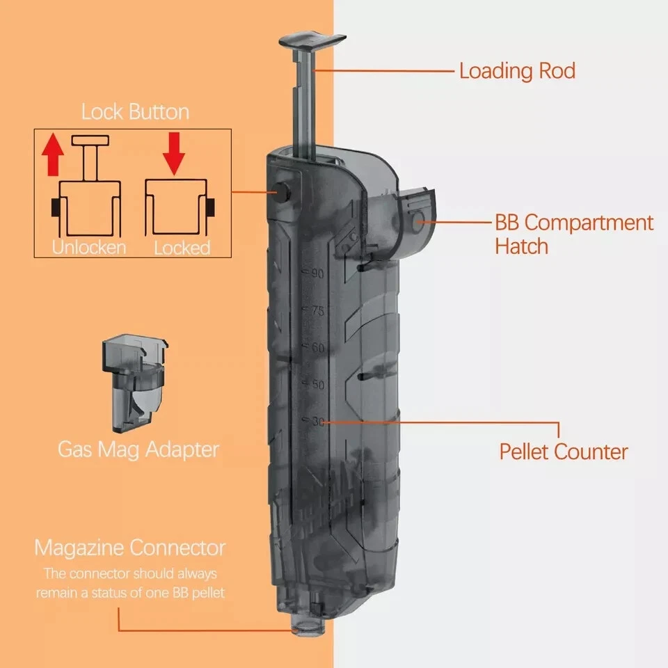 100 Rounds Capacity 【Unique Design】Easy to use, super simple to load. Built-in O-ring in feeding nozzle keeps BBs from falling out. Clear plastic can see exactly how many bbs are left. Fits standard-cap mags, mid-cap mags, shotgun shells, grenades, and revolvers. Gas magazine adapter included. 【Fast Loading】Easier and faster than loading each BB one by one. Smooth loading of about 4 bb’s per push. Loads the BBs 10x quicker than by hand. Spend more time honing shooting skill as opposed to filling magazines. 【High Quality】The airsoft speed loader is made from PC premium quality plastic, durable construction. High-quality steel spring for faster resetting the plunger. 【Large Capacity】Can only hold up to 100 rounds of 6mm BBS, holds enough BB pellets to fill a large magazine, with a large capacity storage function. 【Pocket Size】 Lightweight and convenient to carry, easy to pack into your bag or keep in your pocket. Only 3.90*1.69*2.64inch.