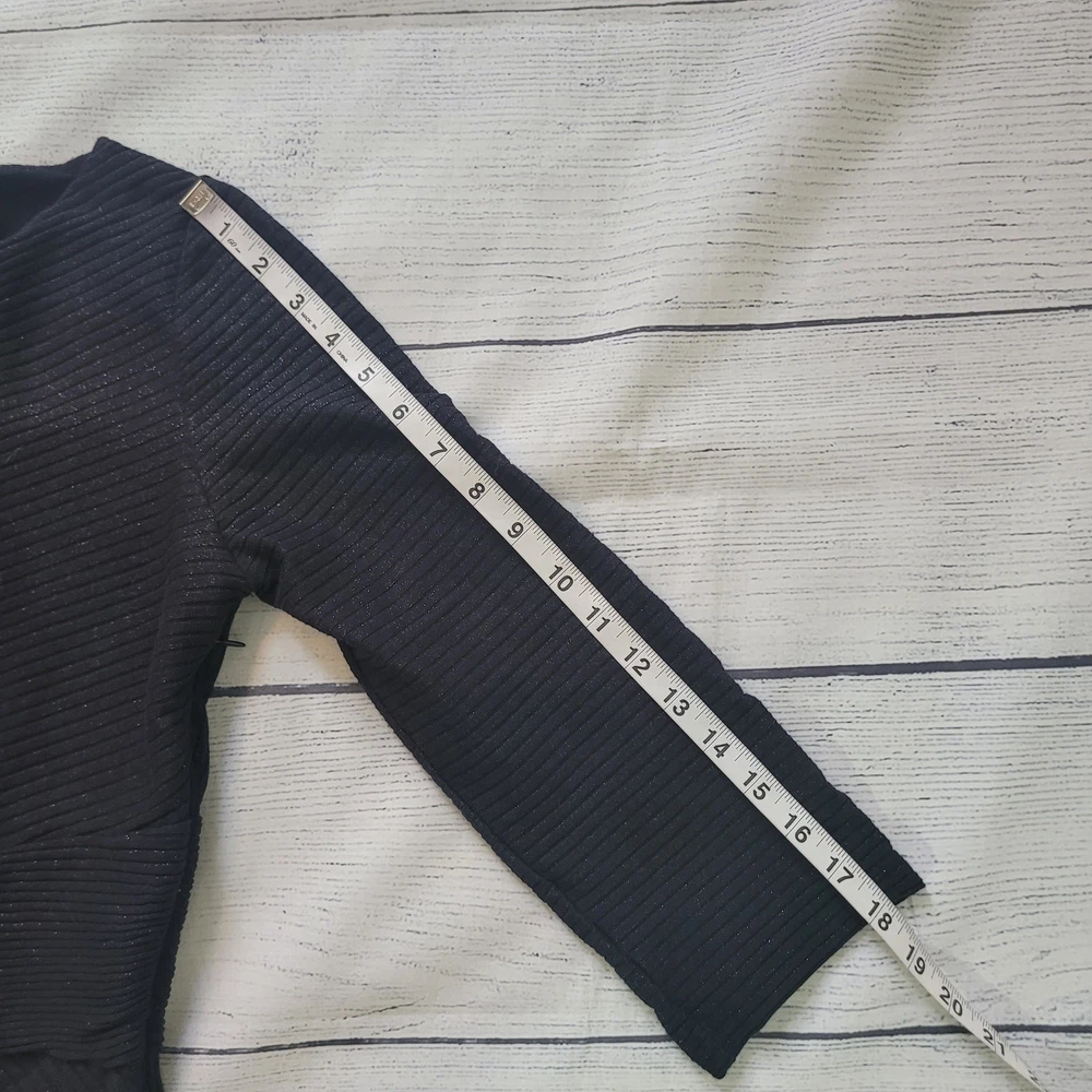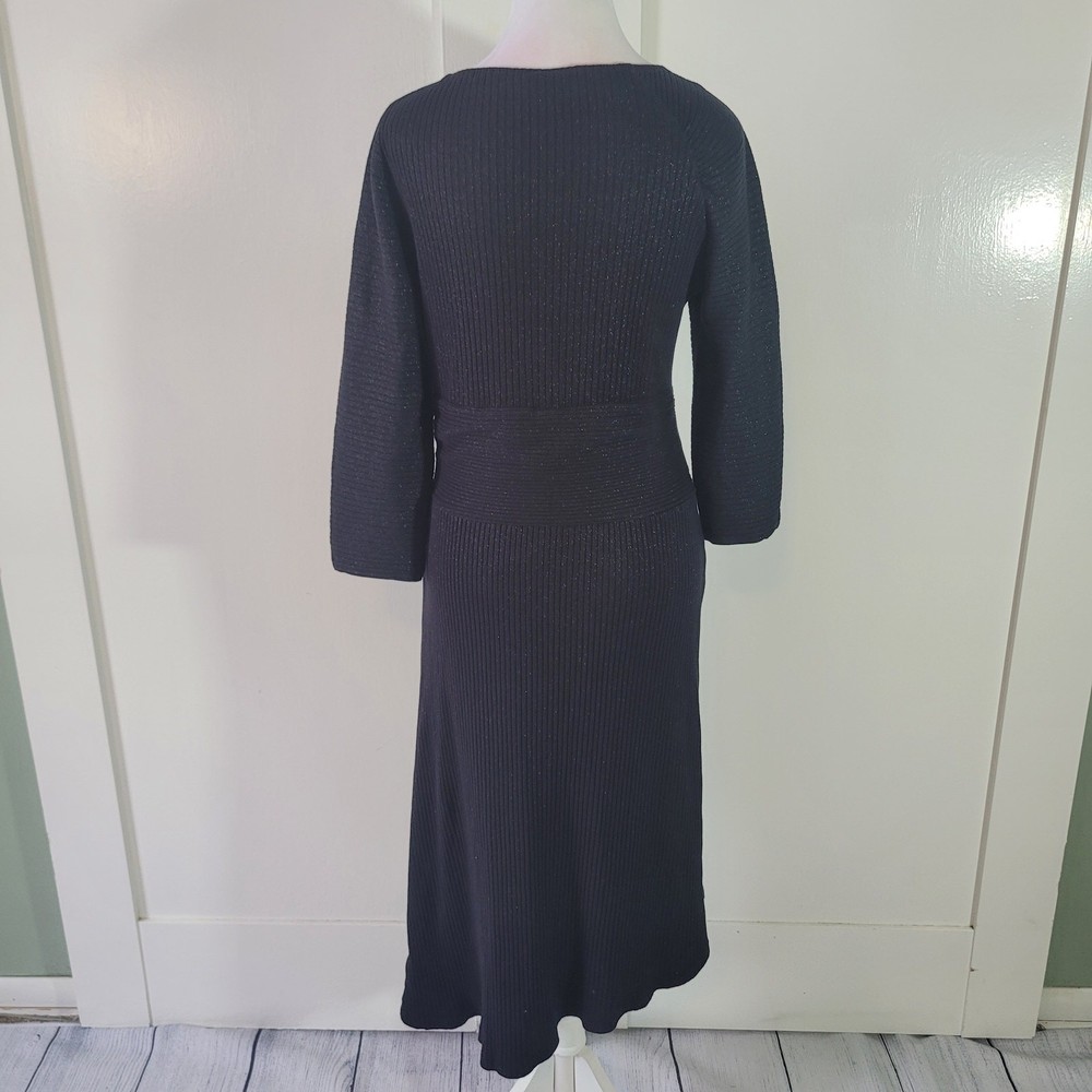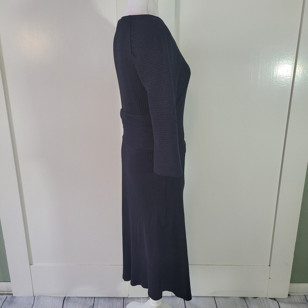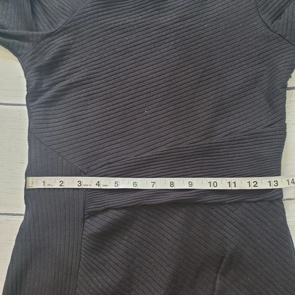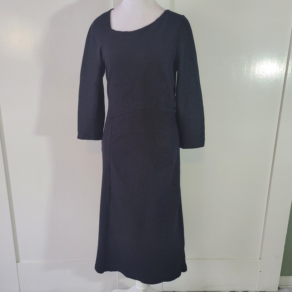 Akemi + Kin Size Anthropoligie Tegan Knit Shimmer Metallic 3/4 Midi Dress Slim sheath silhouette Pullover styling with hidden side zip closure Asymmetrical neckline Asymmetrical hem Hand wash Subtle shimmer Sparkles on ribbed knit fabric -Materials: 58% cotton 38% polyester 4% spandex -Excellent, pre-owned condition. No visible stains, flaws or tears. No to minimal signs of previous wear. -Size tag not listed on garment. Estimated Size M based on size chart. Please refer to measurements Measurements included in photos - please inquire if more are needed. All offers considered - make one today!