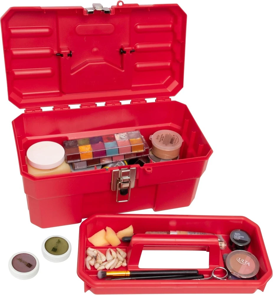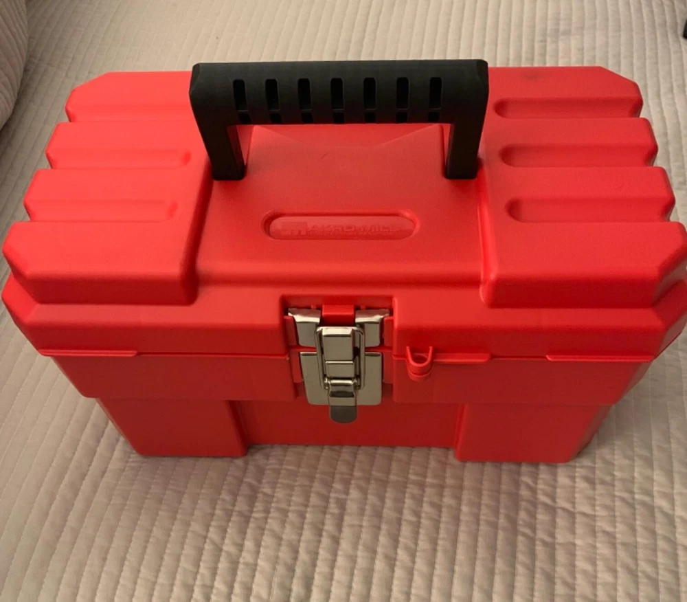 Akro-Mils 09514 ProBox Plastic Toolbox with Removable Tray for Tools, Hobby, Red About this item TOOLBOX OUTSIDE DIMENSIONS- 14-Inch x 8-1/8-Inch x 8-1/8-Inch DURABLE- High quality, durable toolboxes are made from industrial-grade plastic with rounded edges for safety, includes large lift out top tray and comfortable handle GREAT FOR- Storing and transporting supplies like hand tools, nail polish, hobby paint, kids toy tools, first aid, camping utensils, fishing and tackle box accessories, sewing notions, game pieces, calligraphy tools, pens, crayons, markers, and more SECURE- Toolbox features a steel latch with oversized padlock eye, box can be locked with a padlock or a zip tie PROUDLY MADE IN THE USA Product Description These handy Akro-Mils plastic toolboxes are ideal for storing small hardware and hand tools, arts and crafts supplies, and more. Its metal lock-tight latch won't pop open, making it great for traveling and easy to carry with a comfortable handle. Create a manicure supplies organizer box. Organize toys, supplies, or snacks to take with you on car trips. Perfect for creating a Grab-and-Go-Box for emergency supplies, such as a first aid kit. Teachers organize your classroom with school supplies. From the Manufacturer No-nonsense, professional tool boxes in a class of their own. Akro-Mils products save time and money by helping to increase material handling efficiency in virtually any industry. Our broad range of storage, organization and transport products are used to shorten assembly times, maintain accurate inventories, optimize storage space and improve parts protection. Our mission at Akro-Mils is a commitment to manufacturing innovative storage and material handling products of uncompromising quality at a fair price. We support this commitment with professional representation and consistent, superior service to meet the needs of our customers. For quality products backed by more than 60 years of reliable delivery and responsive customer service, we invite you to turn to the Akro-Mils advantage.