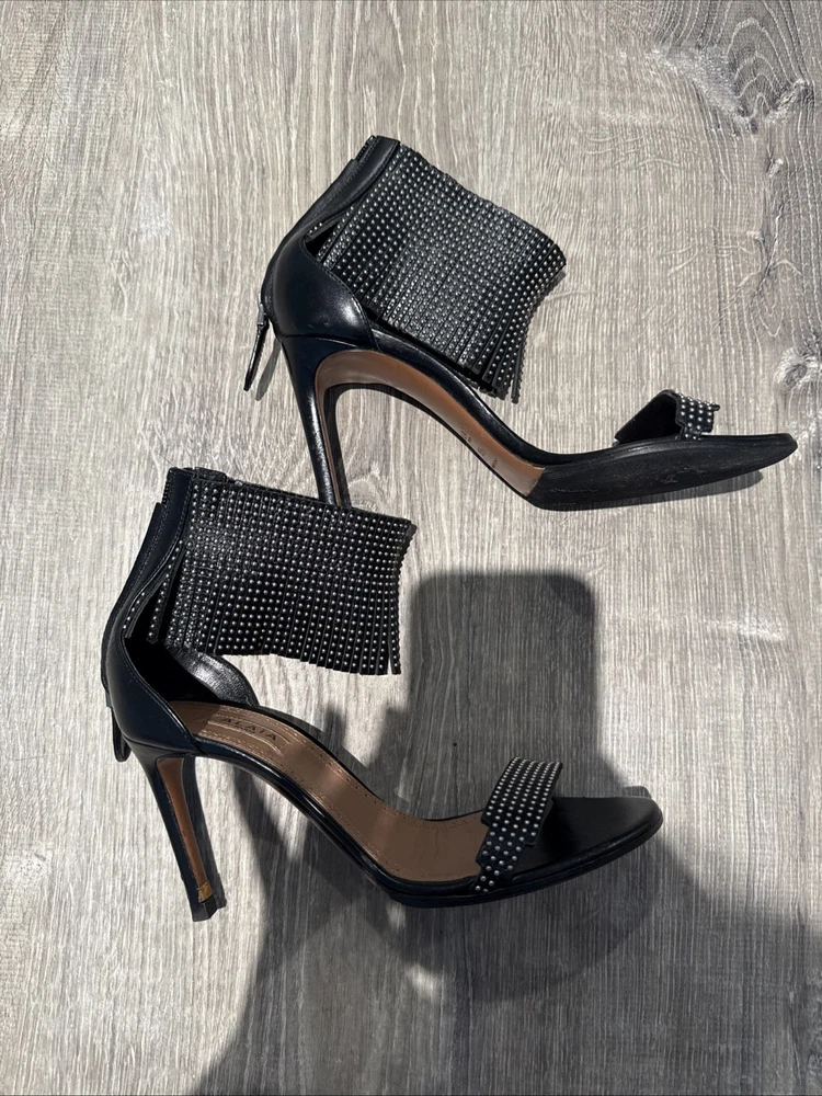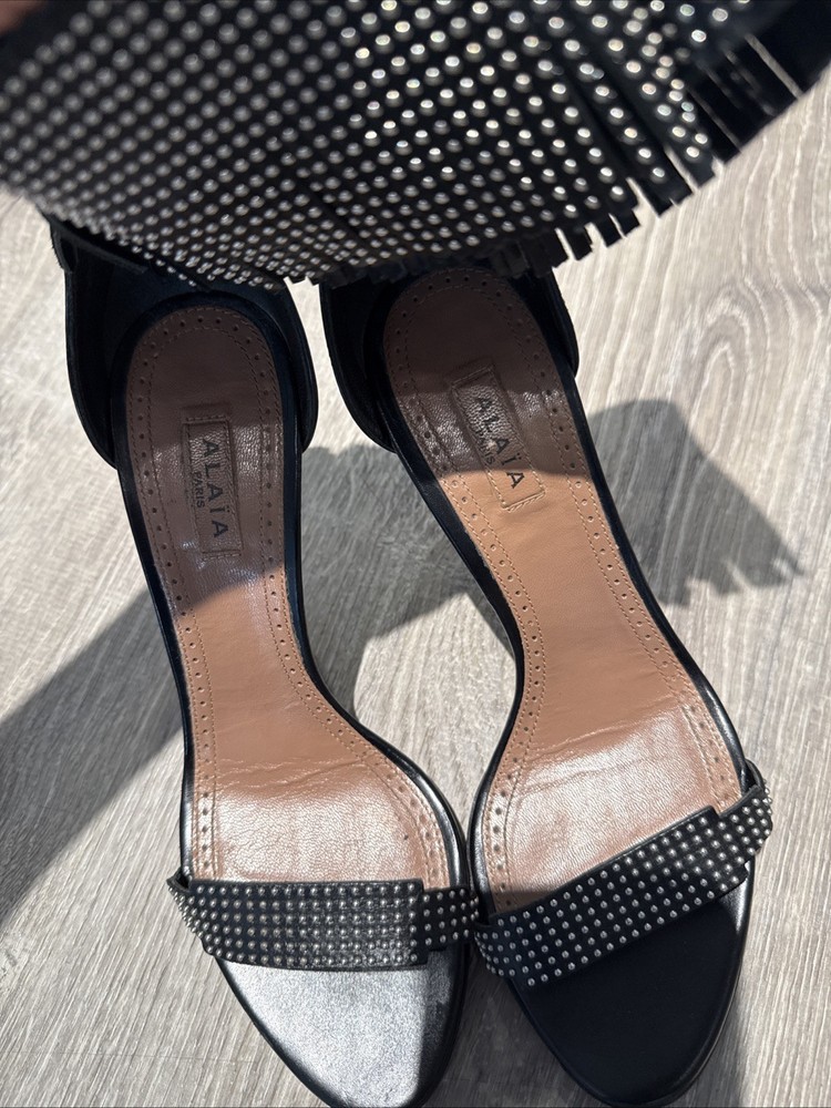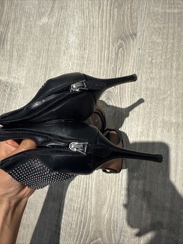 The Alaia Shoes Women's in size 35.5 feature a sleek black frame with a shield style design. Made by the renowned brand Alaia, these shoes are a stylish and chic addition to any woman's wardrobe. The black color adds a touch of elegance, making them versatile for both casual and formal occasions. With their unique shield style, these shoes are sure to make a statement and elevate any outfit.