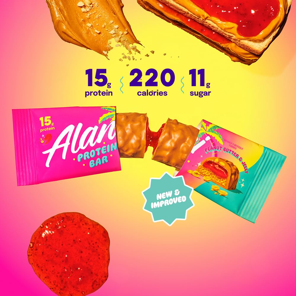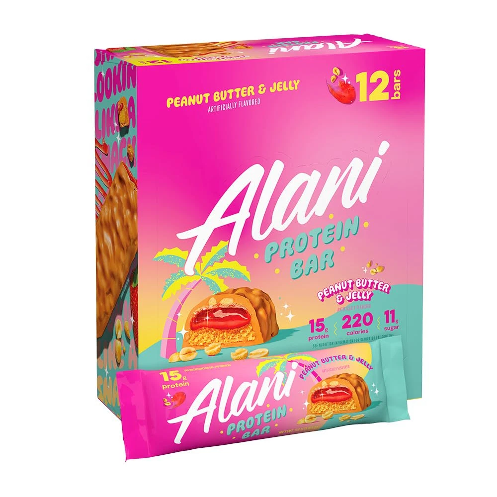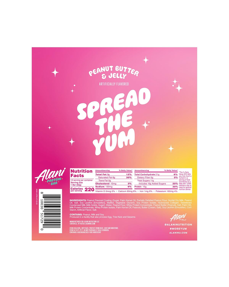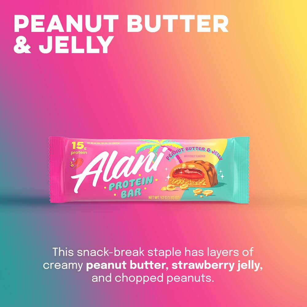 HIGH PROTEIN SNACKS: Each Alani Nu protein bar has up to 16 grams of protein to provide quick and sustained energy on the go! Perfect to pack in gym bags, stock your pantry - Our protein bars feature your favorite flavors, plus they're packed with all the nutrients you need and none of the fillers you don't PRE AND POST WORKOUT FUEL: Crush your goals, build strength, and recover quickly with Alani protein bars. Eat as a post workout protein boost or break it up and eat as a snack throughout the day - Each Bar has under 7 grams of sugar and under 200 calories. CRAVABLE FLAVORS: With a strawberry smear and a buttery dip, our Peanut Butter & Jelly Alani Protein Bars are gluten free, deliciously soft & gooey, and great for when you're on the go! Plus – no matter which way you slice it – we pack in 15g of protein in just 220 calories and 11g of sugar! CONTAINS: Peanut, Milk and Soy. Produced in a facility that also processes Egg, Tree Nuts and Sesame. GLUTEN FREE PROTEIN BARS: Alani Protein Bars are formulated to be gluten free and contain less sugar to keep the goodness within each bar. 100% transparent ingredients mean no proprietary blends, so you know exactly what you’re putting into your body – keep the protein, lose the fillers. ALANI NU PROTEIN BARS: Here for your taste buds – Alani Nu was Founded in 2018 by entrepreneur and influencer, Katy Hearn, Alani Nu is a health and wellness brand focused on providing low-calorie products with unique flavors. Check out everything else from Alani Nu and follow us through our brand store to stay up to date on all things Alani!Â