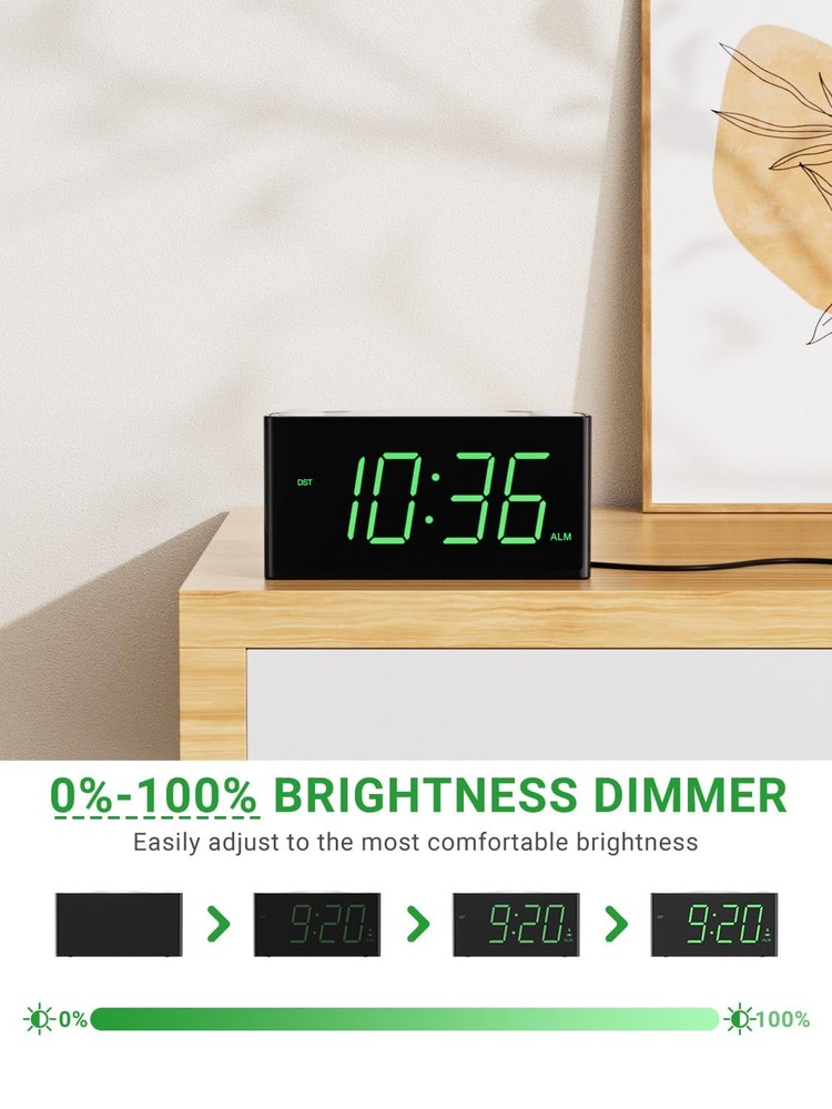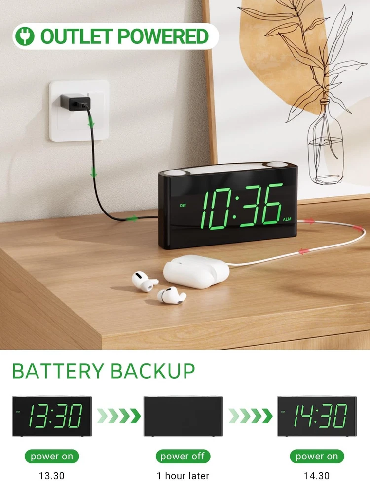 Lighted, LED Display, Battery Backup, USB Charging Port, 24-Hour Display, Dual Alarm, Large Display, Digital, Vibrating, Night Light, Alarm, 12-Hour Display