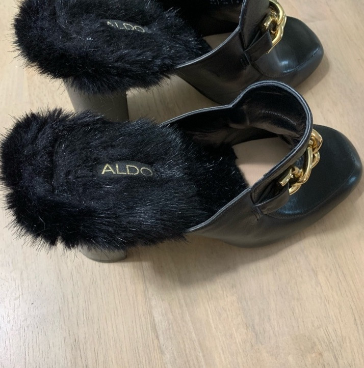 Aldo mules with leather uppers, faux fur on heal inner, attractive gold chain, very little wear. #C22