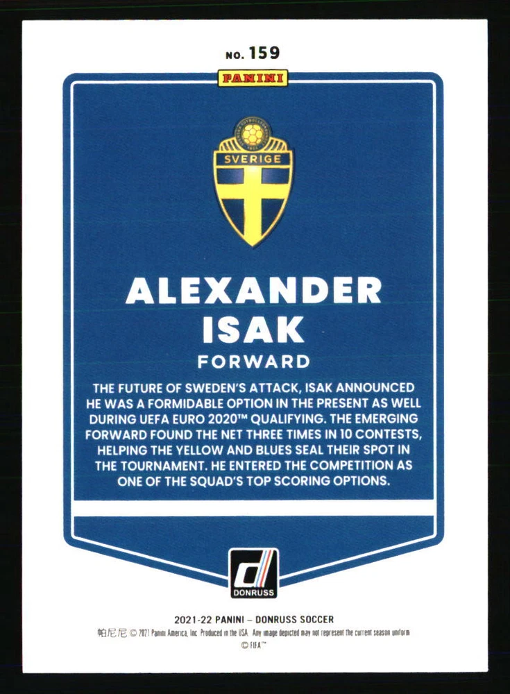 Manufacturer: Donruss Season: 2021 Year Manufactured: 2021 Player|Athlete: Alexander Isak Card Number: 159 Team: Sweden Graded: No Sport: SOCCER Type: Sports Trading Card Set: 2021-22 Donruss Autographed: No