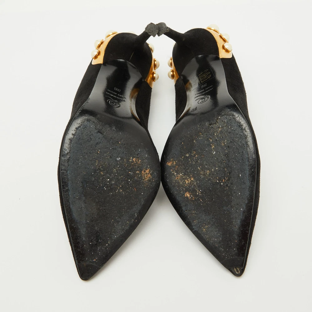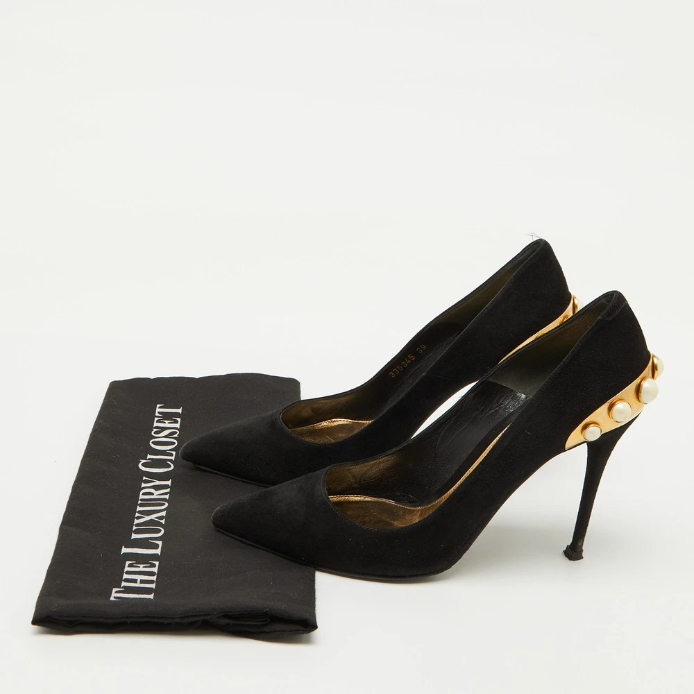 Make a chic style statement with these designer pumps. They showcase sturdy heels and durable soles, perfect for your fashionable outingsCertified by The Luxury Closet - This item has gone through a detailed authentication process overseen by our experts. We offer a lifetime guarantee of authenticity on all our items. Import duties, taxes and charges are not included in the item price. These charges are the buyers responsibility. Please check with your country’s customs office to determine what these additional cost will be prior to buying. Our eBay Store About Us Contact Us Add to Favorite Sellers Alexander McQueen Black Suede Gold Trimmed Faux Pearl Pumps Size 39 $203.5 Make a chic style statement with these designer pumps. They showcase sturdy heels and durable soles, perfect for your fashionable outings Product Details Brand Color Black Dimensions Material Suede Size 39 Outsole Width 8.5 cm Outsole Length 25 cm Heel Height 10.5 cm Includes The Luxury Closet Packaging Certified by The Luxury Closet This item has gone through a detailed authentication process overseen by our experts. We offer a lifetime guarantee of authenticity on all our items. How We Check The in-house team of experts at The Luxury Closet is highly trained to verify the authenticity and the condition of the luxury products. They ensure that only 100% authentic items are put on sale.The evaluation process is unique with its own mix of assessment criteria and differs according to the category. Each item is evaluated based on the following combination of hallmarks, hardware, stitching, symmetry, material, craftsmanship, stamping, codes, hologram stickers, and packaging. Our authenticators also check if the items have been modified or amended (e.g., aftermarket diamonds, replaced batteries, repaired bags, etc.) International Buyers Import duties, taxes and charges are not included in the item price. These charges are the buyers responsibility. Please check with your country’s customs office to determine what these additional cost will be prior to buying.