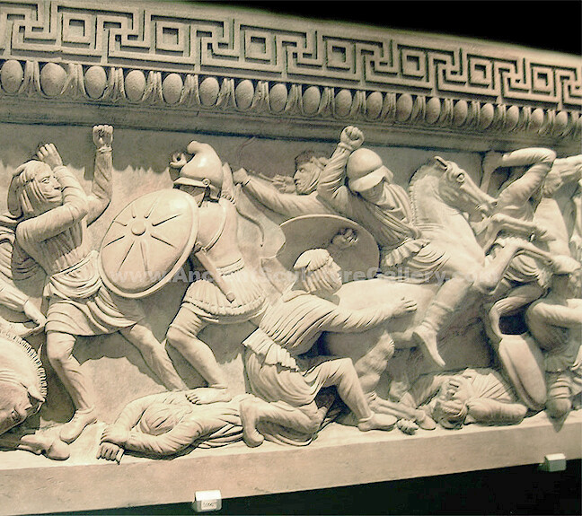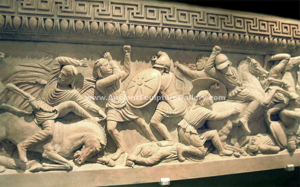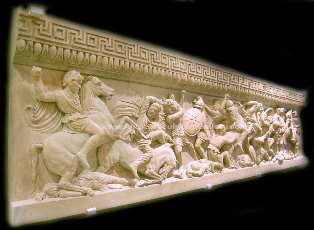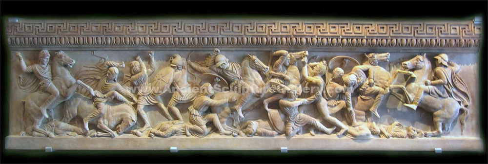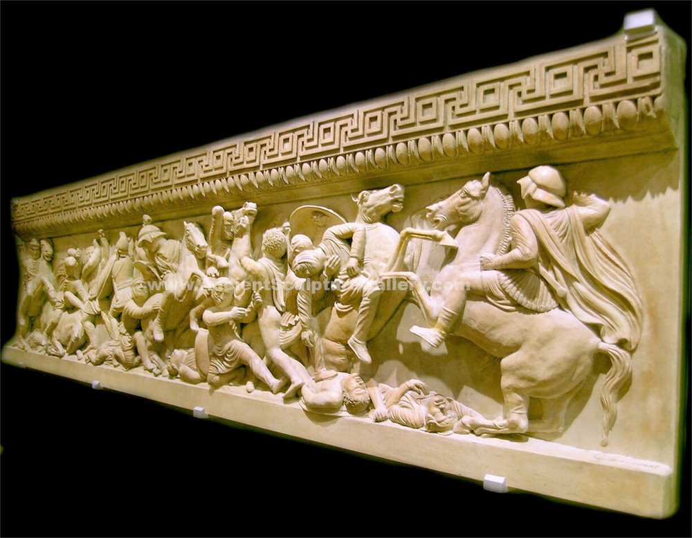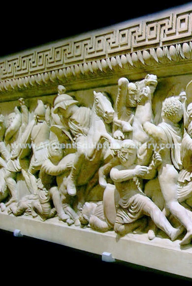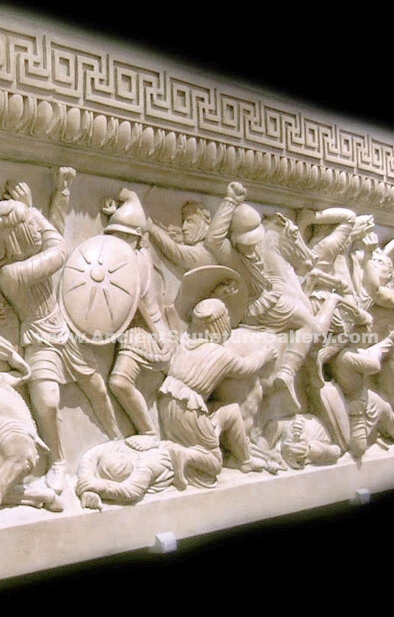 Alexander the Great Sarcophagus Battle Greek Hellenistic Sculpture large plaque Period: Greek Age (7th-4th century B.C.) Artist: ancient Greek artist Item No. 011 Weight: 170 lbs (77 kg). Dimensions: W: 72" H: 22" D: 5.5" (183cm x 56cm x 14cm). Made of cast stone and hand-finished in antique finish his is one of the four panels of the Alexander Sarcophagus, the battle scene showing Macedonians and Persians fighting each other. This is the most beautiful plate of the Alexander Sarcophagus. It shows Alexander the Great on horse wearing his lion's scalp (the first figure), Alexander's closest Companion Hephaestion is also on horse in the middle of the plate, and the Macedonian general Perdiccas (the last figure, also on horse). Made of cast stone. Cast stone is a type of gypsum cement whose properties are much different from plaster of paris which is what most sculpture shops use. Unlike plaster, which is soft, light and weak, cast stone is hard, heavy and strong. Cast stone feels like, and is heavy like a real stone would be, which can be experienced as soon you try to lift it. Finish: Antique Stone THIS ITEM IS BRAND NEW! PAYMENT: We accept PayPal, VISA, Master Card, American Express, Discover. Feel free to contact us if you have any questions. SHIPPING USA: Displayed shipping charges are within USA (except Alaska, Hawaii, Puerto Rico and APO/FPO). Please contact us for shipping quote if ordering outside continental USA. SHIPPING INTERNATIONAL: We accept international orders and we ship worldwide. Please contact us for an international shipping quote prior to placing an order. Please make sure to let us know your city and postal code in your country so that we can calculate the most accurate shipping cost for your order. For international shipments, applicable customs import duties of your country, local taxes and brokerage fees, may or may not be the responsibility of the receiver at the time of delivery. Please check with your country's local customs office for more information regarding these possible charges. RETURNS: We insure all of our shipments and are very careful about how our items are packaged and shipped. If in an unlikely event you receive a damaged item, please contact us the same day so that we can file a damage claim with the shipper. Please note that you will need to present a proof of the damage – emailing us pictures is acceptable. Returns are accepted within the time-frame specified in this listing. You may exchange this item or receive a refund for your return, provided it is returned undamaged in original condition and packaging. Shipping charges are not refundable. Buyer pays for return shipping charges. Items should be returned insured for your protection. Visit our store for more great products! Feel free to ask any questions you may have.
