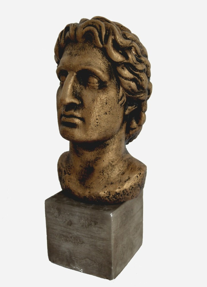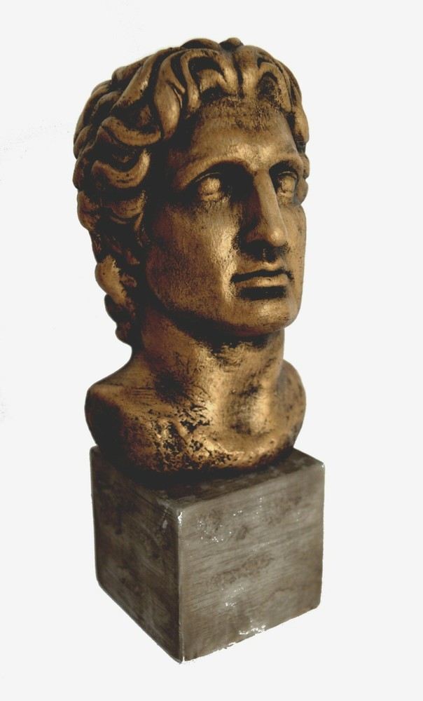 This sculpture is made of casting stone with bronze effect colour! Details: Condition: New, reproduction handmade in Greece. Approximately Height: 22.5cm - 8.8 inches Width: 9cm - 3.5 inches Weight: 1.5kg Material: Casting stone Alexander the Great, was a king (basileus) of the Ancient Greek kingdom of Macedon and a member of the Argead dynasty. Born in Pella in 356 BC, Alexander succeeded his father, Philip II, to the throne at the age of twenty. He spent most of his ruling years on an unprecedented military campaign through Asia and northeast Africa, and by the age of thirty he had created one of the largest empires of the ancient world, stretching from Greece to northwestern India. He was undefeated in battle and is widely considered one of history's most successful military commanders.(B301) Tracking number provided!!! Please be aware that, due to the fact that our products are either individually cast, carved, hand painted and hand finished, there will inevitably be minor variations in size, colour and texture.
