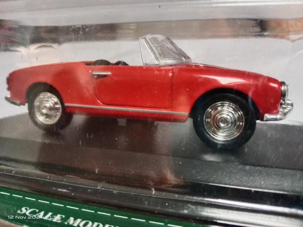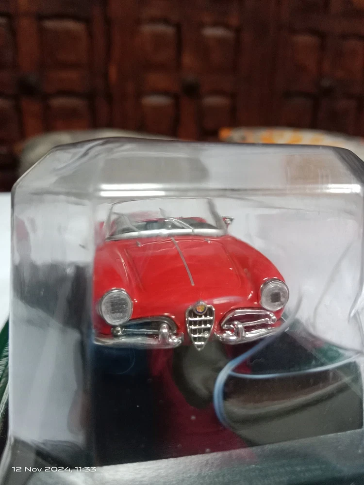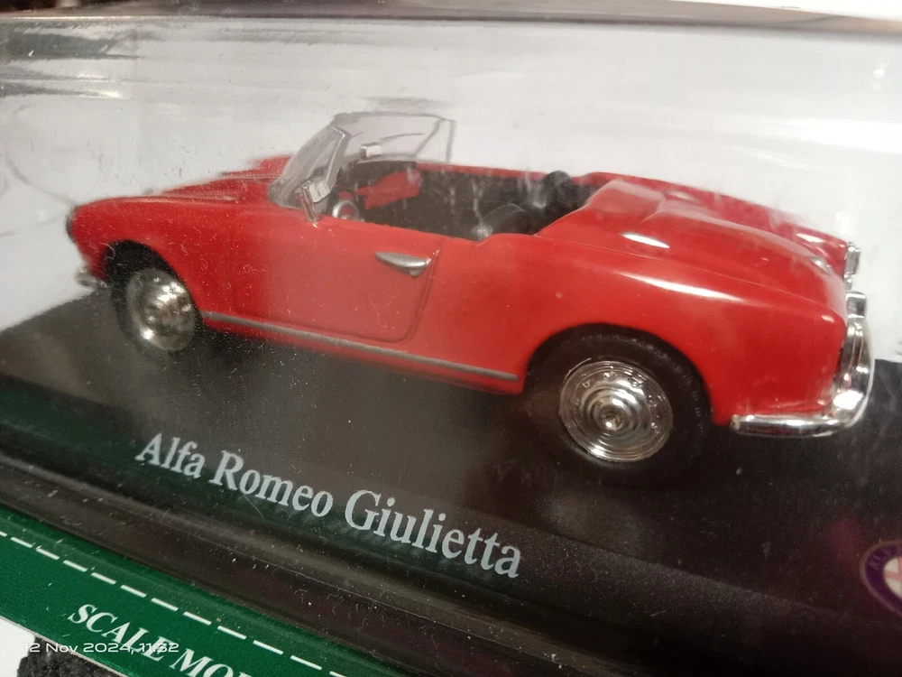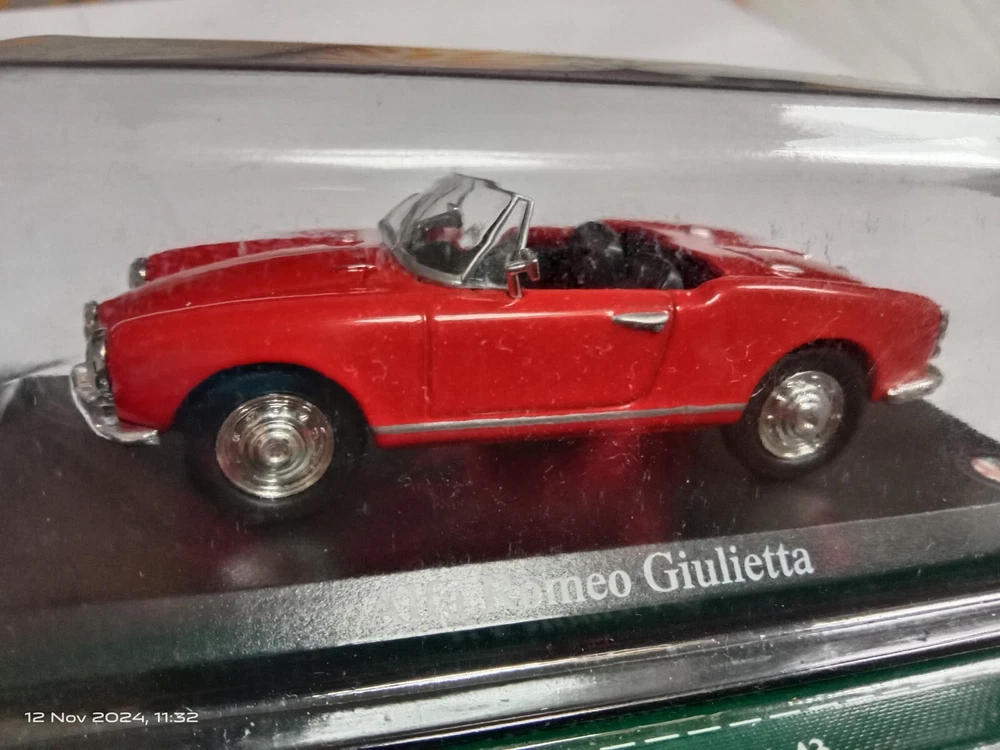 Add a classic to your collection with this 1:43 scale model of the iconic Alfa Romeo Giulietta in red. This die-cast model captures the elegance of the vintage convertible, perfect for collectors or Alfa Romeo enthusiasts. The model is in new, unopened condition, though the box shows some minor damage from storage. Brand appears to be Del Prado (please confirm from photos). This item is a must-have for collectors of classic car miniatures. Secure it now and own a piece of automotive history!"