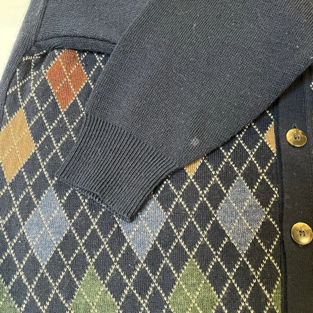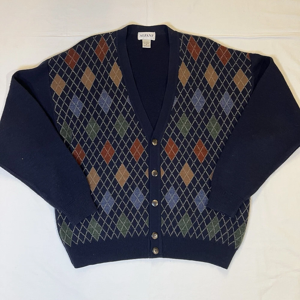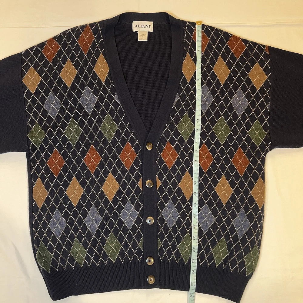 CONDITION: Sweater is pre-owned in great condition. One small stain on the back of the right sleeve (see photo). This Alfani men's cardigan sweater in size medium features a classic V-neck, button-up front, and a tight-knit design with an argyle/diamond pattern in blue. Made of a wool blend (wool and acrylic), this vintage sweater is suitable for travel, casual, or business occasions. It has long sleeves and a regular fit, making it a stylish and comfortable choice for the winter, fall, and spring seasons.