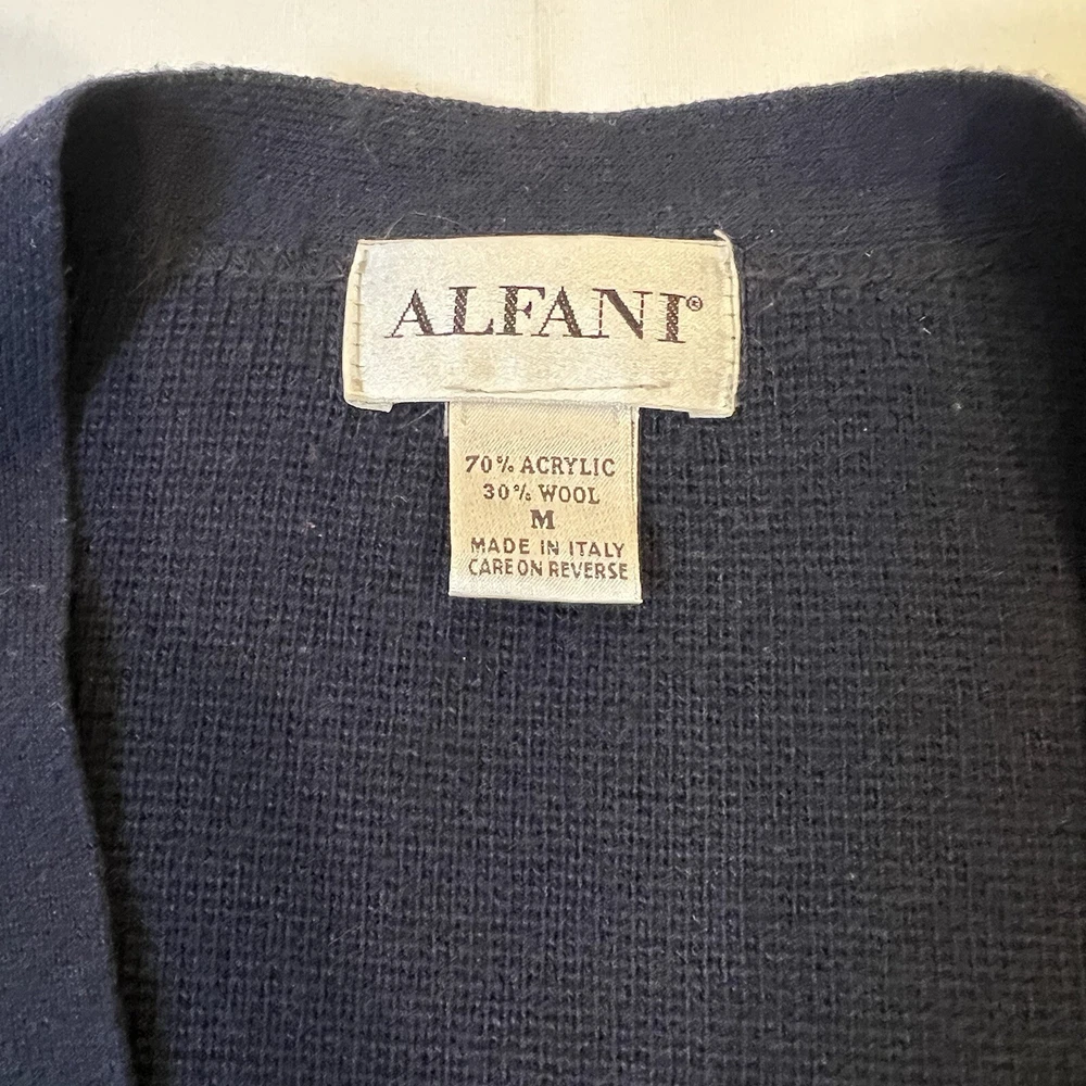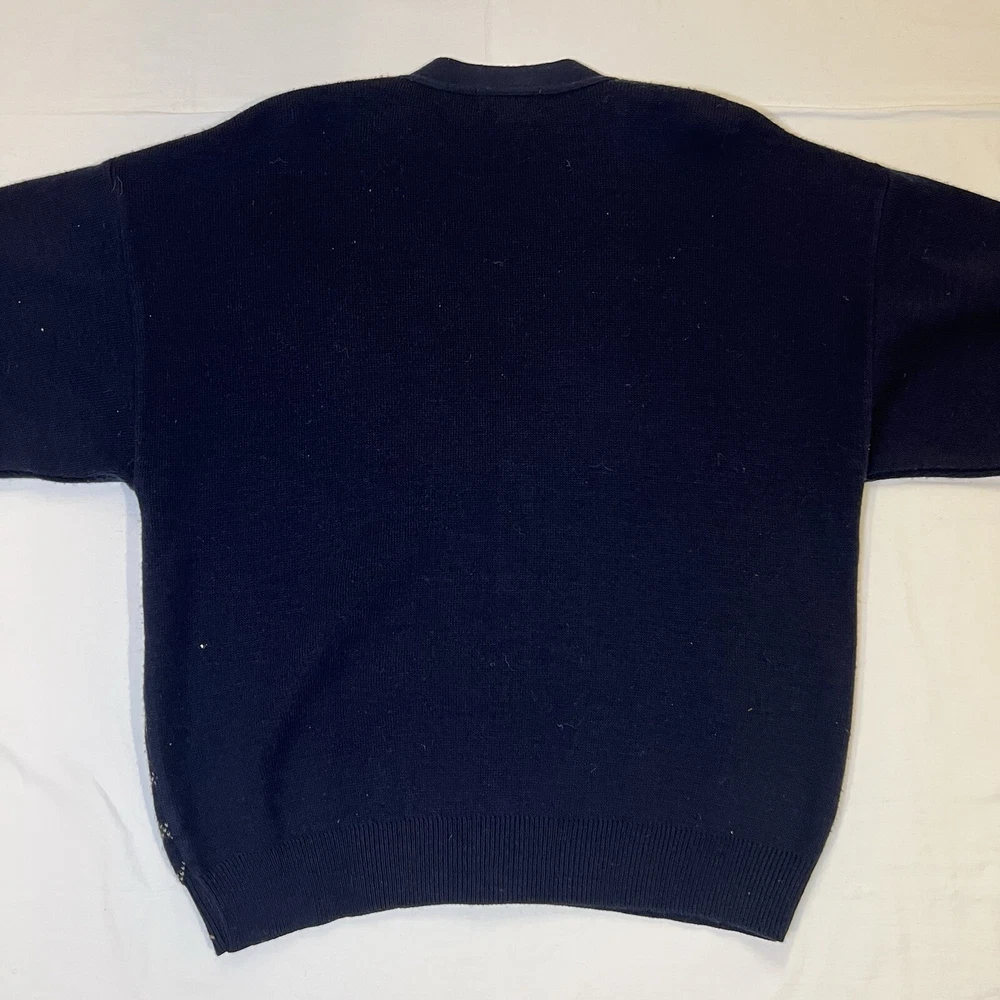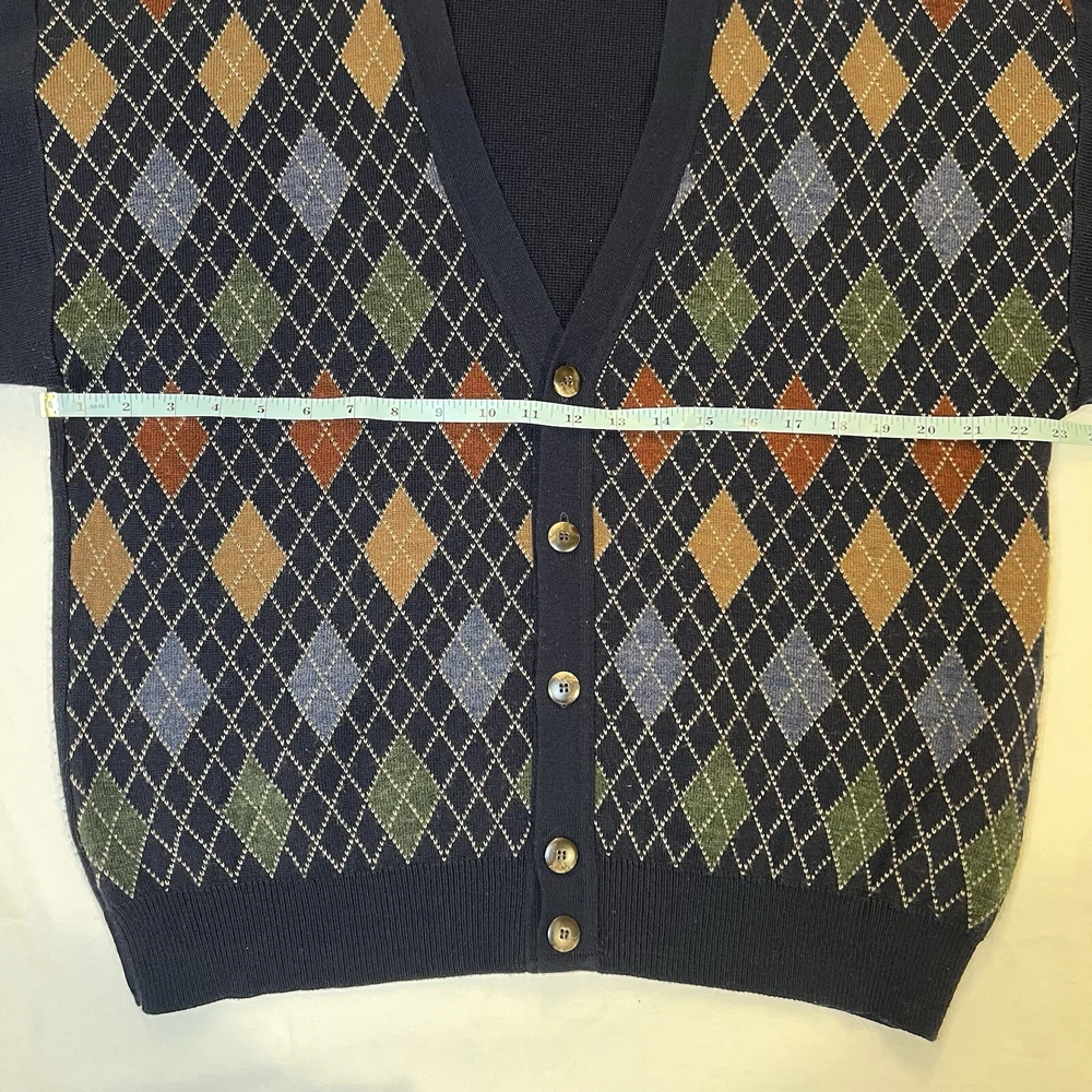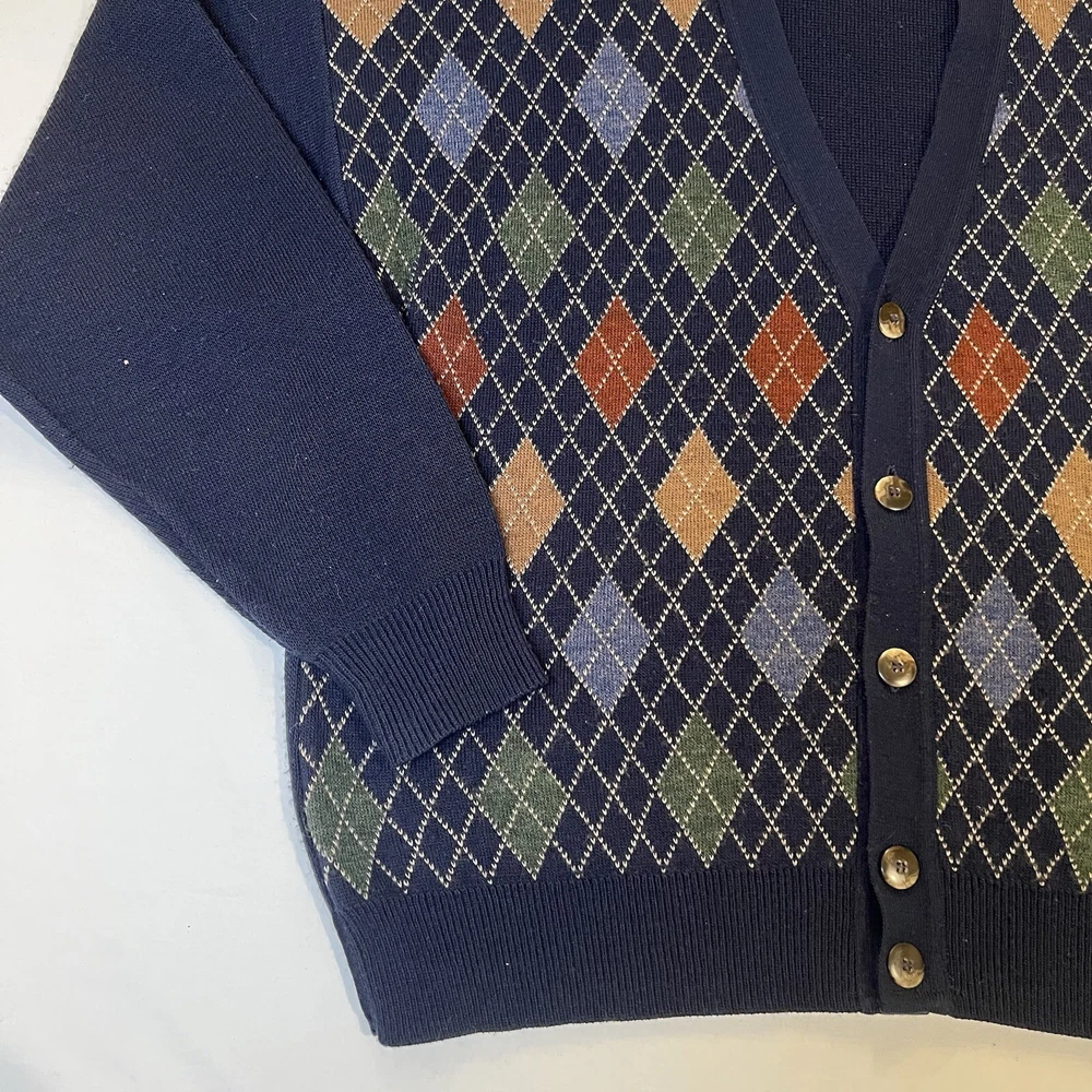 CONDITION: Sweater is pre-owned in great condition. One small stain on the back of the right sleeve (see photo). This Alfani men's cardigan sweater in size medium features a classic V-neck, button-up front, and a tight-knit design with an argyle/diamond pattern in blue. Made of a wool blend (wool and acrylic), this vintage sweater is suitable for travel, casual, or business occasions. It has long sleeves and a regular fit, making it a stylish and comfortable choice for the winter, fall, and spring seasons.