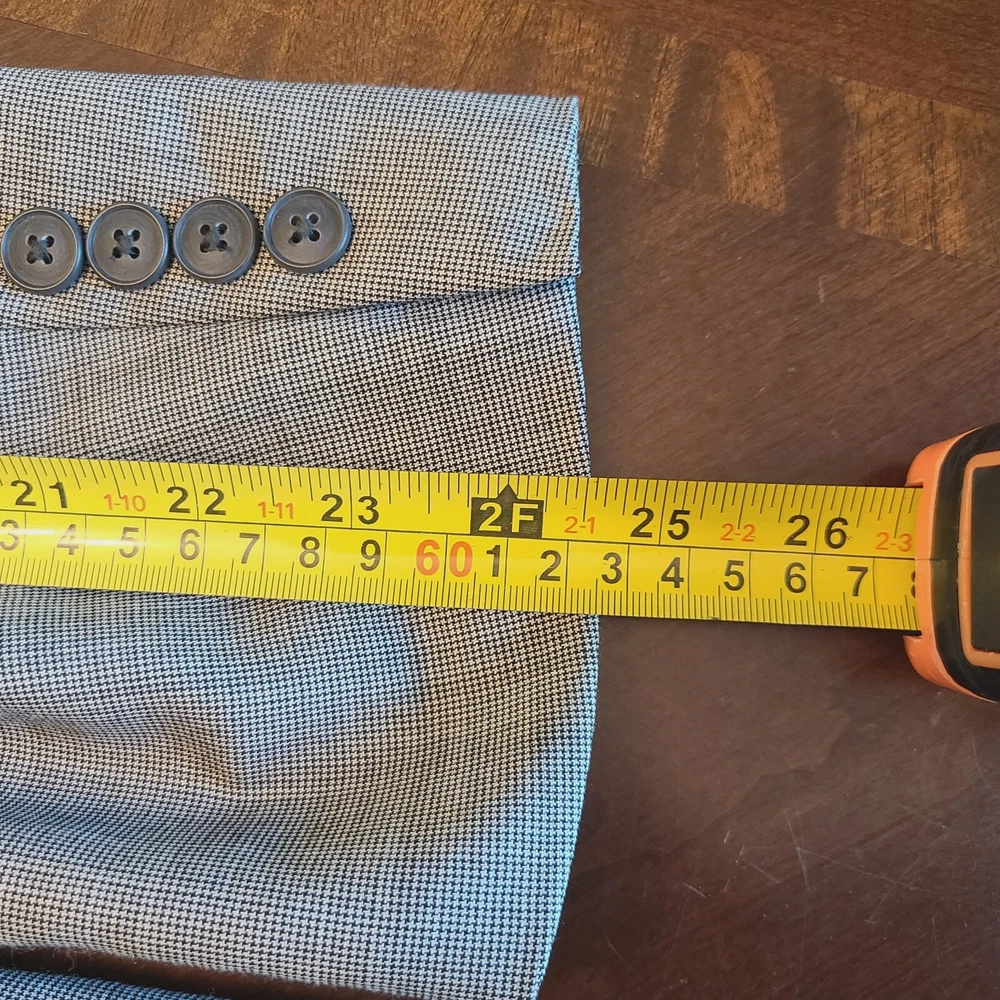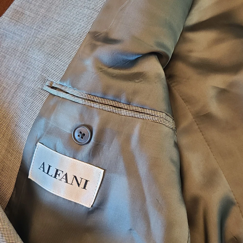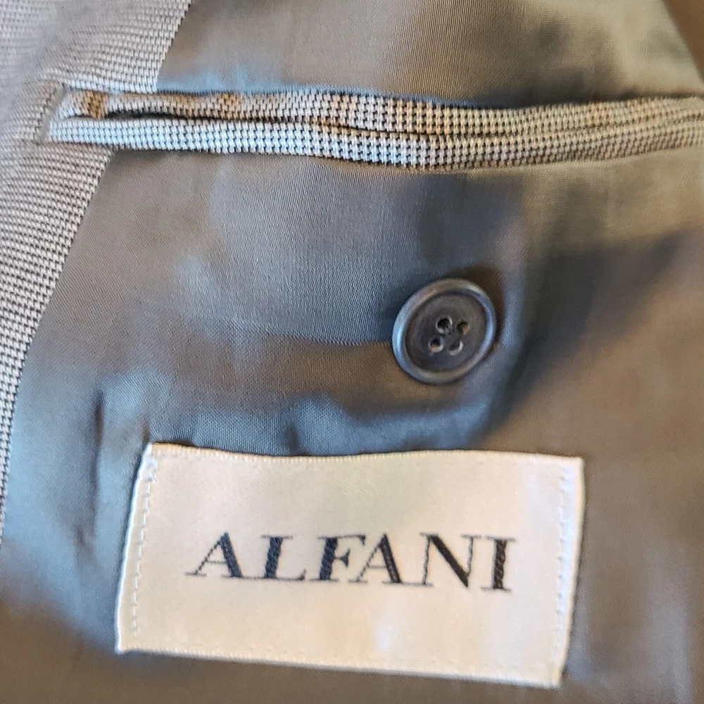 Product Overview Upgrade your wardrobe with this Alfani light gray houndstooth blazer , a sophisticated and versatile piece perfect for both professional and semi-formal occasions. Made from a luxurious wool blend with cashmere , this blazer provides softness, warmth, and durability. With its classic three-button front and structured design , it delivers an elegant and polished look. Made in Korea , this high-quality piece ensures premium craftsmanship. Key Features Brand: Alfani Style: Single-Breasted Blazer Size: 42S Color: Light Gray Pattern: Houndstooth Material: 87% Wool, 8% Cashmere, 5% Polyester Lining: Fully Lined (Gray) Measurements (Approximate): Chest (Pit to Pit x2): ~44 inches Length (Collar to Bottom): ~30 inches Sleeve Length: ~24.5 inches Shoulder Width: ~19 inches Closure: Three-Button Front Lapel Style: Notch Lapel Vent Style: Single-Vent Back Pockets: All Pockets Are Fully Functional (Exterior & Interior) Fabric Type: Wool - Cashmere - Polyester Care Instructions: Dry Clean Only Made in: Korea Condition Pre-owned in excellent condition , showing minimal signs of wear. No visible stains, rips, or damage. Please review photos for an accurate representation of the item's condition. Why It's Desirable Luxurious Fabric Blend: Wool and cashmere ensure durability, softness, and warmth. Timeless Design: Classic light gray houndstooth pattern adds sophistication to any outfit. Versatile Wear: Perfect for business, weddings, or stylish casual looks. Reputable Brand: Alfani is known for well-tailored, high-quality menswear. Package Includes ✅ Alfani Light Gray Houndstooth Blazer - Size 42S Disclaimer ⭐ Shop & Save: Browse my store for more great finds across various categories! Combine items to save on shipping. ⭐ Fast Shipping: Items are shipped same or next business day once payment is received. ⭐ Condition Transparency: Please review photos and description for details. Colors may vary slightly due to screen settings. ⭐ Pet & Smoke-Free Storage