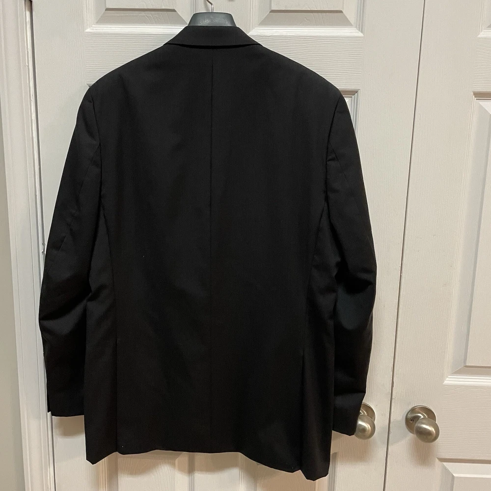 This is an Alfani men's sport coat in size 46L with a slim fit and a black pinstripe design. Made from 100% wool, this two-button blazer features a peak lapel style and a double-vented jacket vent style. Ideal for various occasions like travel, weddings, parties, and more, this sport coat also includes inner pockets and is lined with viscose/rayon. The jacket is suitable for all seasons and adds a touch of classic style with a modern slim fit.