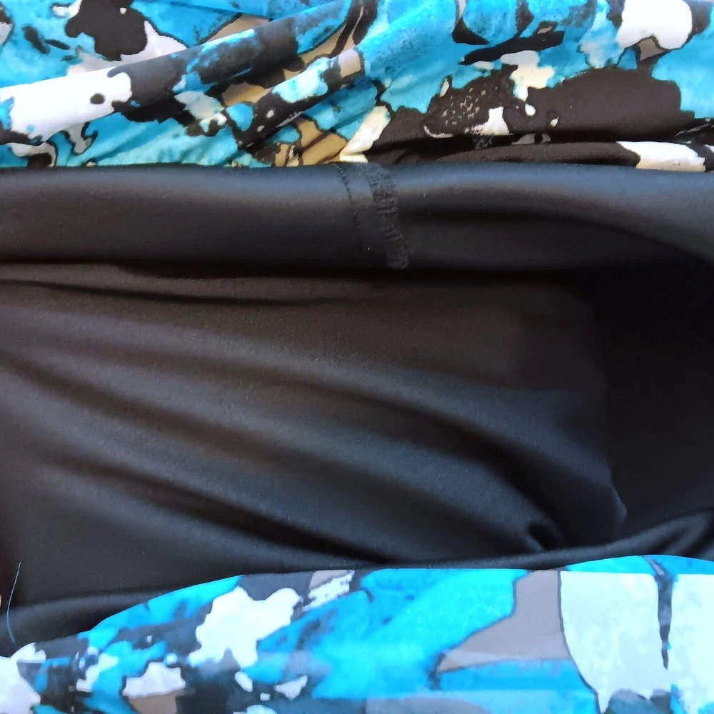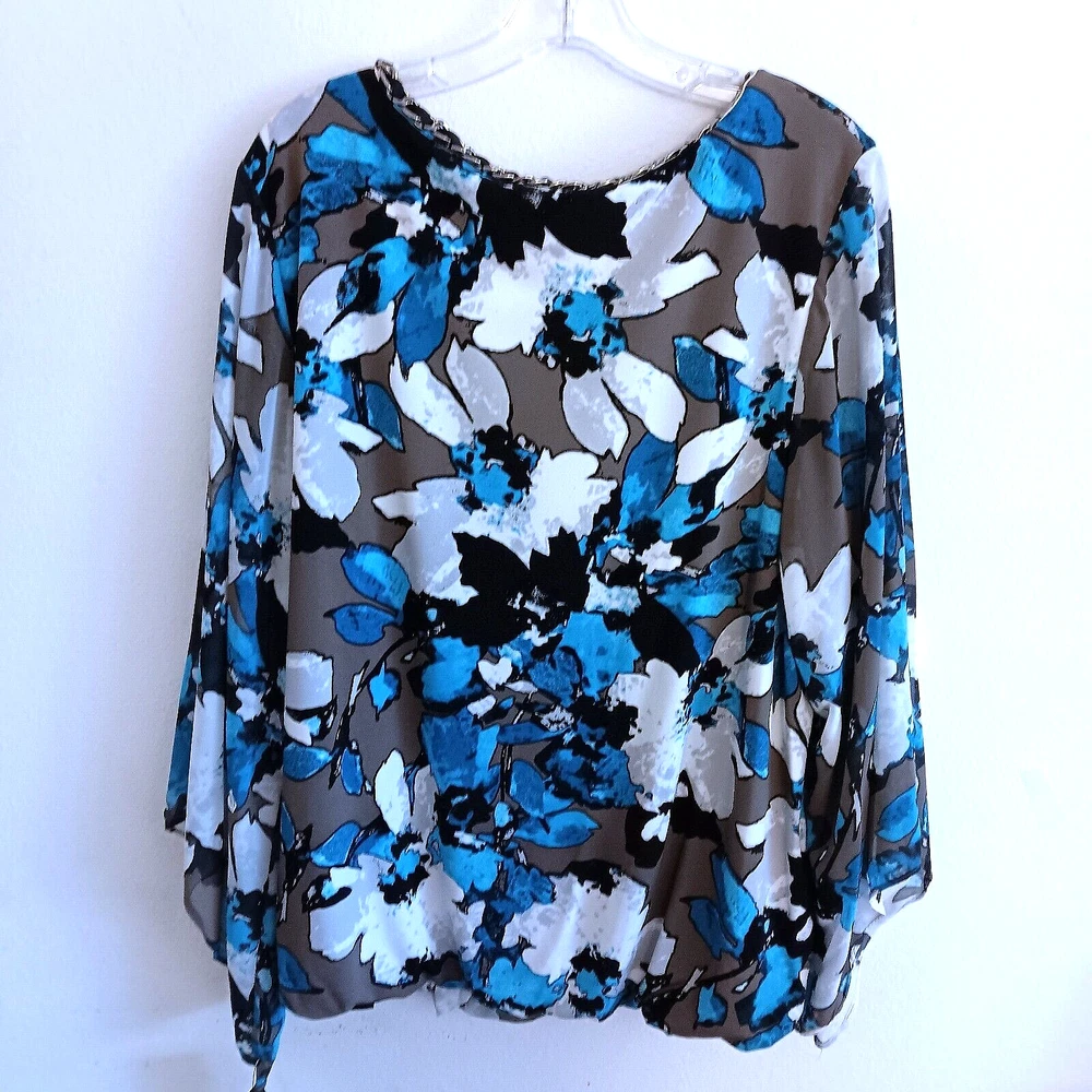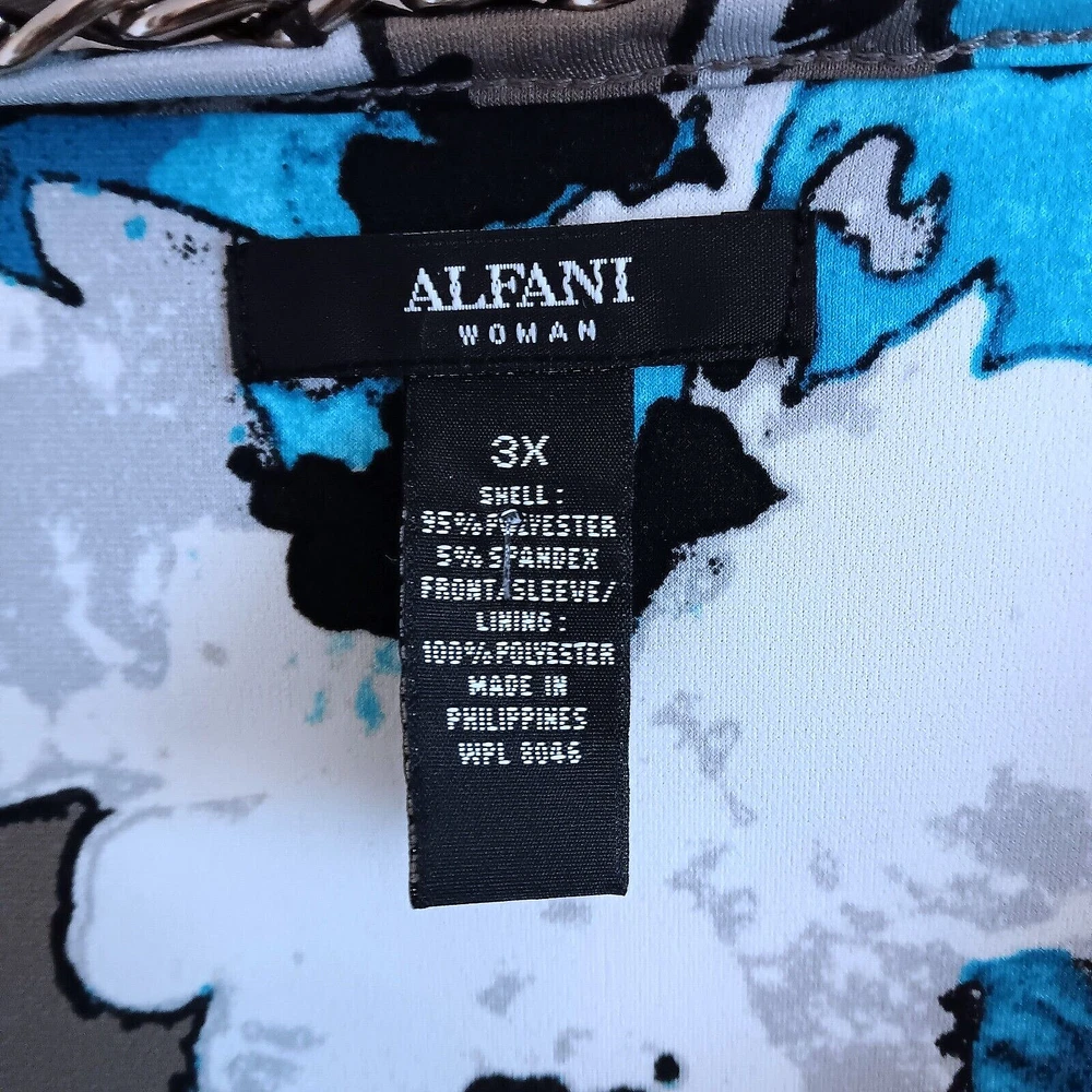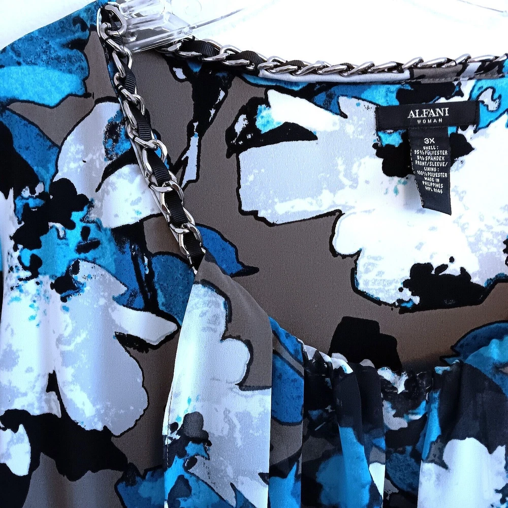 Elevate your wardrobe with the Alfani Woman Black White Turquoise Top, a versatile piece that seamlessly transitions from day to night. The blouse features a vibrant floral pattern that adds a splash of color to any outfit. With its flattering round neckline and chic 3/4 flared sleeves, this top is a stylish choice for those who appreciate a blend of elegance and comfort. Crafted from a soft polyester blend, the blouse ensures a comfortable fit for plus-size women in a 3X size type. The multicolor design is perfect for pairing with your favorite skirts or trousers, making it a must-have for any fashion-forward collection. Embrace the blend of basic and colorful styles to create looks that are both timeless and on-trend. This is brand new with the tags and is a size 3X. It is black, white turquoise, gray and brown. It has silver link chain around the collar with a black ribbon going through it. PLEASE NOTE : It does have a faint perfume smell but should could out when washed. The measurements are approximately 50" bust and 28" in length . The 3/4 sleeves are sheer and flair at the end. It does have a black lining on the bottom half. It does have elastic at the bottom. It is polyester and spandex. Thanks for looking